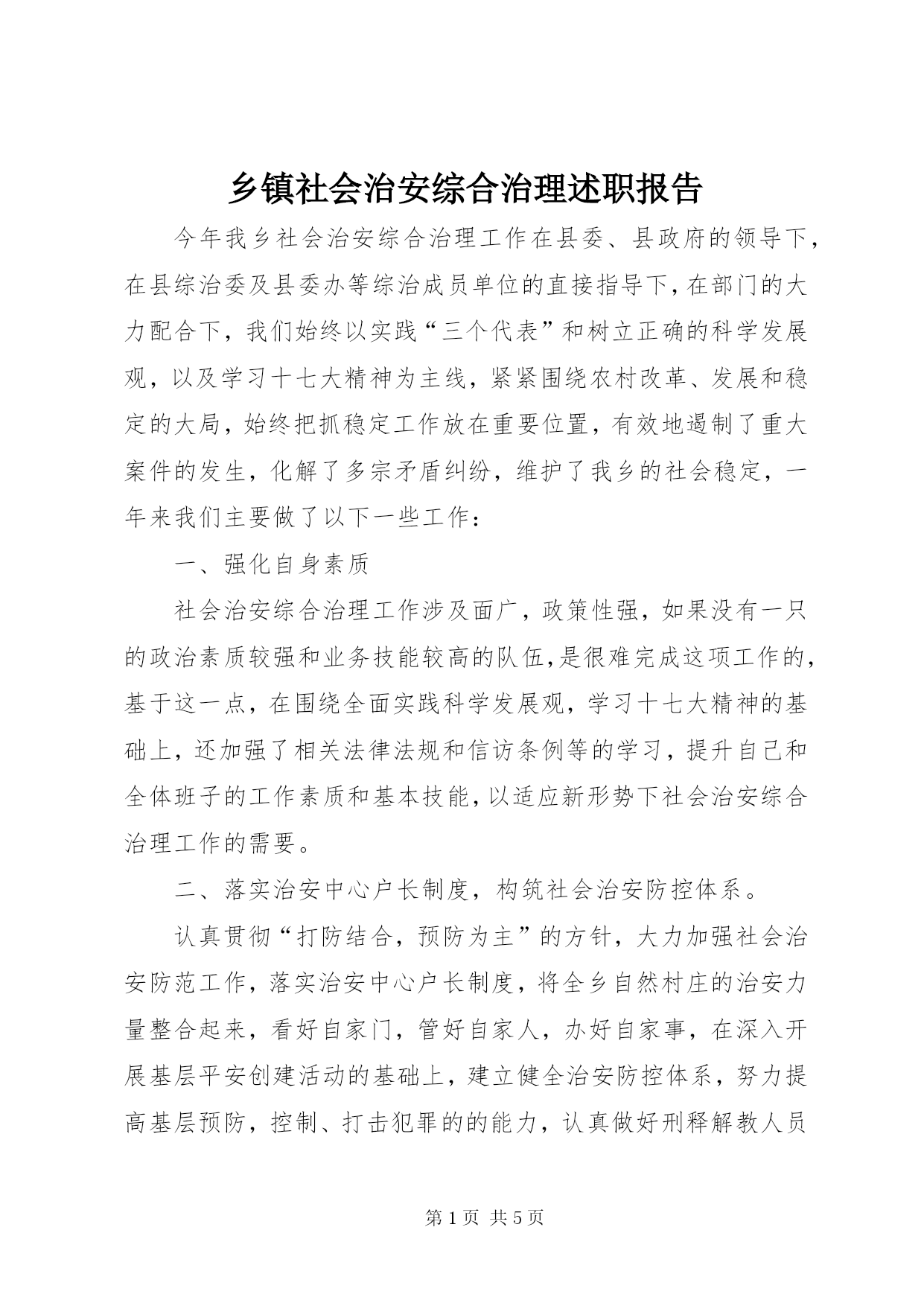 第PAGE\*Arabic\*MERGEFORMAT5页共NUMPAGES\*MERGEFORMAT5页乡镇社会治安综合治理述职报告今年我乡社会治安综合治理工作在县委、县政府的领导下,在县综治委及县委办等综治成员单位的直接指导下,在部门的大力配合下,我们始终以实践“三个代表”和树立正确的科学发展观,以及学习十七大精神为主线,紧紧围绕农村改革、发展和稳定的大局,始终把抓稳定工作放在重要位置,有效地遏制了重大案件的发生,化解了多宗矛盾纠纷,维护了我乡的社会稳定,一年来我们主要做了以下一些工作:一、