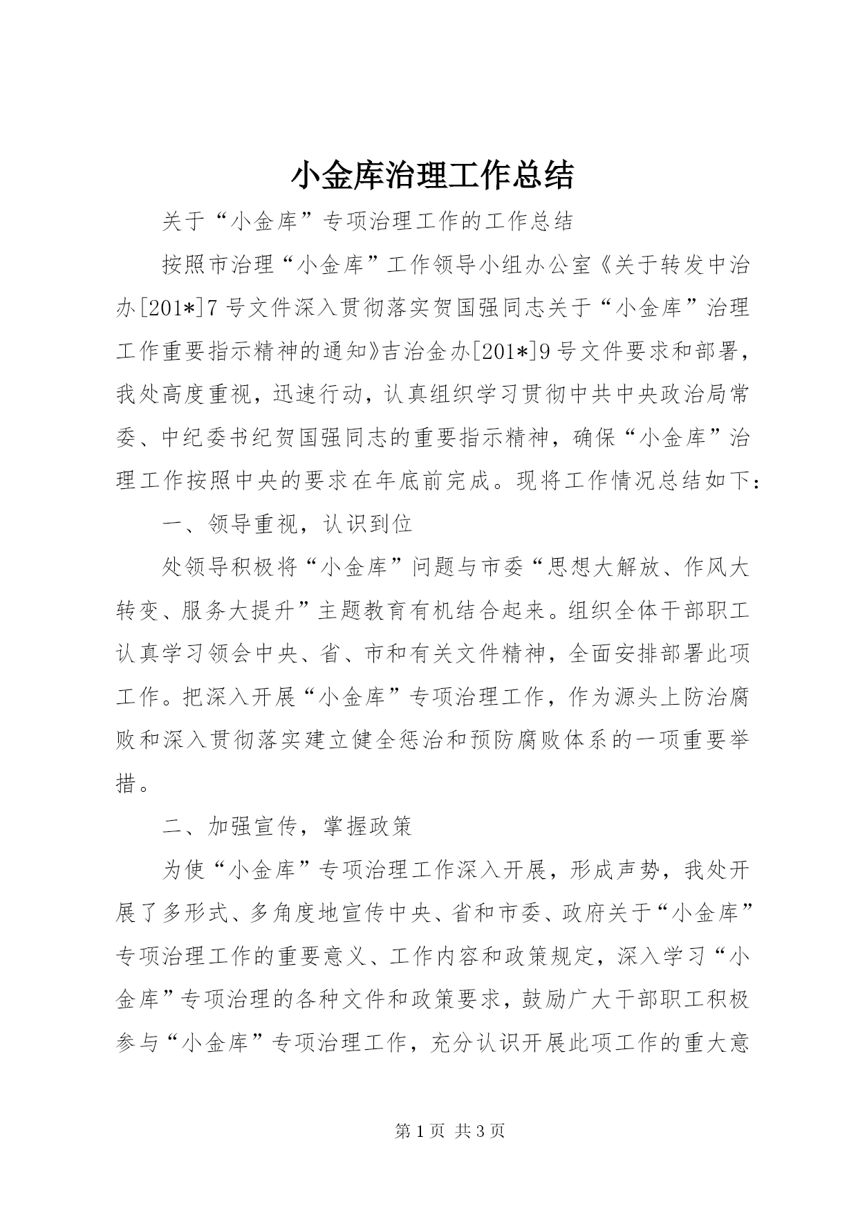 第PAGE\*Arabic\*MERGEFORMAT3页共NUMPAGES\*MERGEFORMAT3页小金库治理工作总结关于“小金库”专项治理工作的工作总结按照市治理“小金库”工作领导小组办公室《关于转发中治办[201*]7号文件深入贯彻落实贺国强同志关于“小金库”治理工作重要指示精神的通知》吉治金办[201*]9号文件要求和部署,我处高度重视,迅速行动,认真组织学习贯彻中共中央政治局常委、中纪委书纪贺国强同志的重要指示精神,确保“小金库”治理工作按照中央的要求在年底前完成。现将工作情况总结