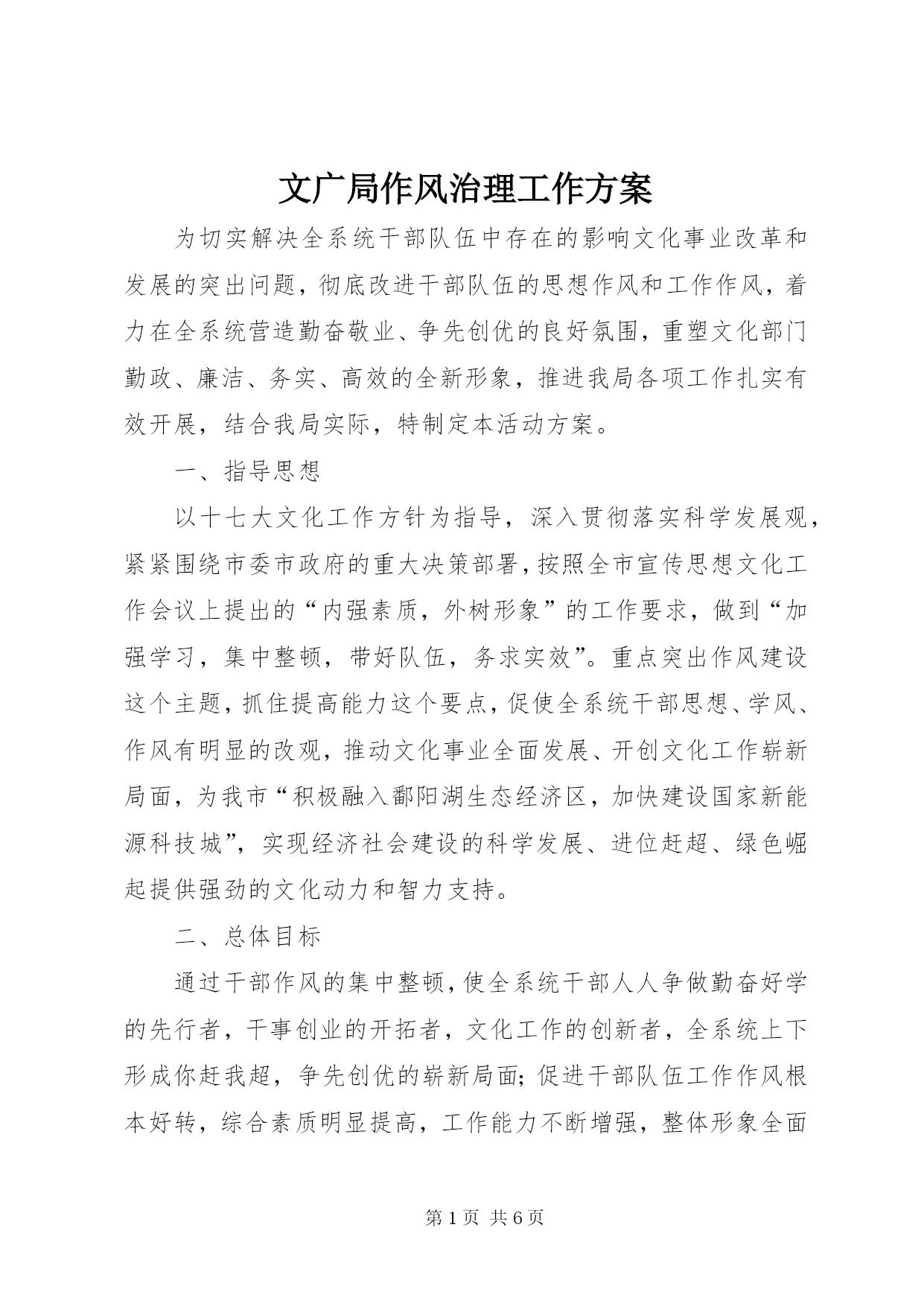 第PAGE\*Arabic\*MERGEFORMAT6页共NUMPAGES\*MERGEFORMAT6页文广局作风治理工作方案为切实解决全系统干部队伍中存在的影响文化事业改革和发展的突出问题,彻底改进干部队伍的思想作风和工作作风,着力在全系统营造勤奋敬业、争先创优的良好氛围,重塑文化部门勤政、廉洁、务实、高效的全新形象,推进我局各项工作扎实有效开展,结合我局实际,特制定本活动方案。一、指导思想以十七大文化工作方针为指导,深入贯彻落实科学发展观,紧紧围绕市委市政府的重大决策部署,按照全市宣传思想