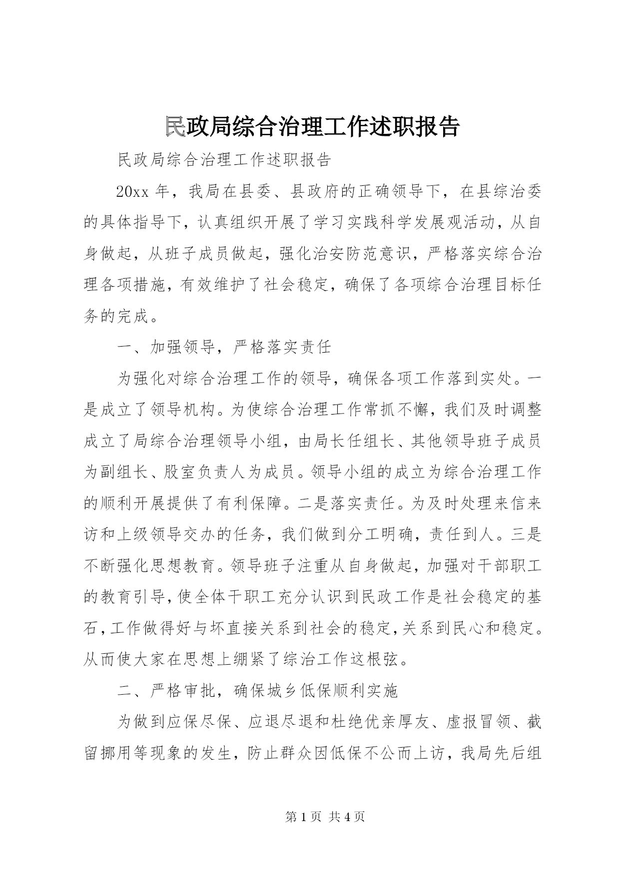 第PAGE\*Arabic\*MERGEFORMAT4页共NUMPAGES\*MERGEFORMAT4页民政局综合治理工作述职报告民政局综合治理工作述职报告20xx年,我局在县委、县政府的正确领导下,在县综治委的具体指导下,认真组织开展了学习实践科学发展观活动,从自身做起,从班子成员做起,强化治安防范意识,严格落实综合治理各项措施,有效维护了社会稳定,确保了各项综合治理目标任务的完成。一、加强领导,严格落实责任为强化对综合治理工作的领导,确保各项工作落到实处。一是成立了领导机构。为使综合治理工