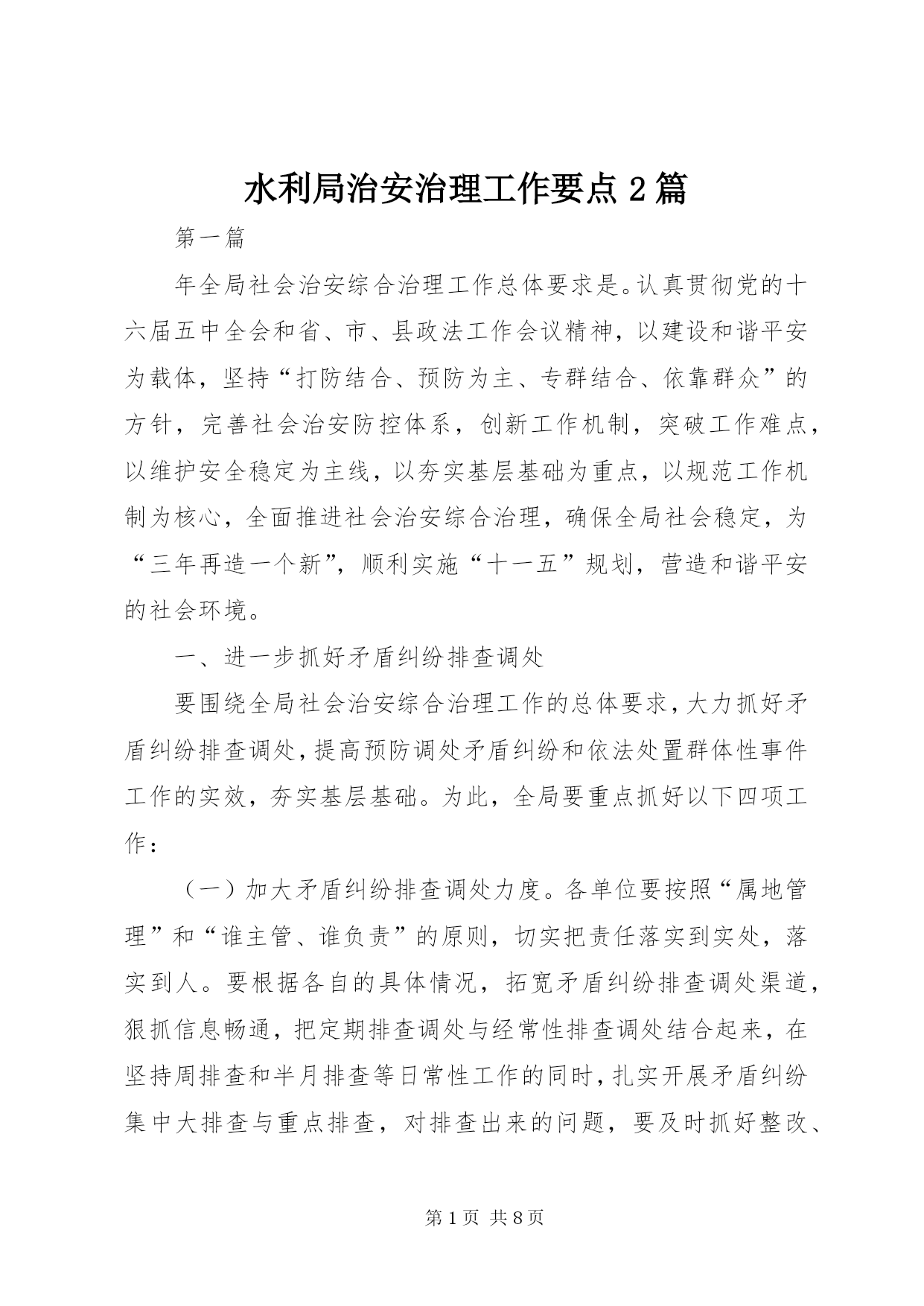 第PAGE\*Arabic\*MERGEFORMAT8页共NUMPAGES\*MERGEFORMAT8页水利局治安治理工作要点2篇第一篇年全局社会治安综合治理工作总体要求是。认真贯彻党的十六届五中全会和省、市、县政法工作会议精神,以建设和谐平安为载体,坚持“打防结合、预防为主、专群结合、依靠群众”的方针,完善社会治安防控体系,创新工作机制,突破工作难点,以维护安全稳定为主线,以夯实基层基础为重点,以规范工作机制为核心,全面推进社会治安综合治理,确保全局社会稳定,为“三年再造一个新”,顺利实施“