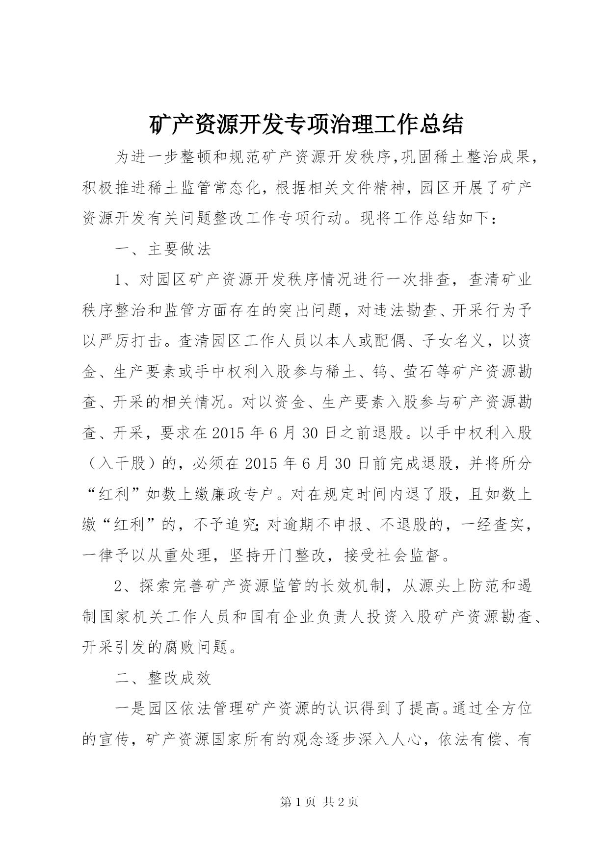 第PAGE\*Arabic\*MERGEFORMAT2页共NUMPAGES\*MERGEFORMAT2页矿产资源开发专项治理工作总结为进一步整顿和规范矿产资源开发秩序,巩固稀土整治成果,积极推进稀土监管常态化,根据相关文件精神,园区开展了矿产资源开发有关问题整改工作专项行动。现将工作总结如下:一、主要做法1、对园区矿产资源开发秩序情况进行一次排查,查清矿业秩序整治和监管方面存在的突出问题,对违法勘查、开采行为予以严厉打击。查清园区工作人员以本人或配偶、子女名义,以资金、生产要素或手中权利入股参