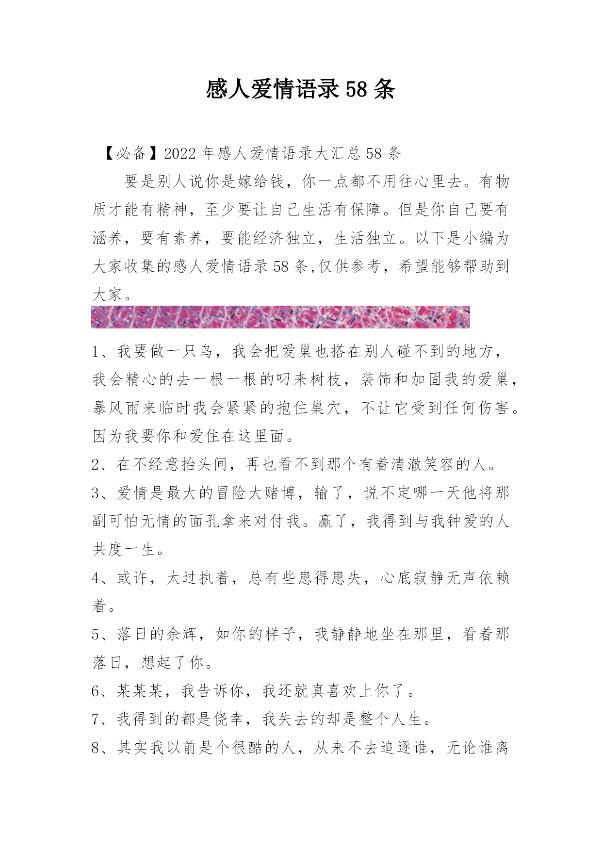 感人爱情语录58条【必备】2022年感人爱情语录大汇总58条要是别人说你是嫁给钱,你一点都不用往心里去。有物质才能有精神,至少要让自己生活有保障。但是你自己要有涵养,要有素养,要能经济独立,生活独立。以下是小编为大家收集的感人爱情语录58条,仅供参考,希望能够帮助到大家。1、我要做一只鸟,我会把爱巢也搭在别人碰不到的地方,我会精心的去一根一根的叼来树枝,装饰和加固我的爱巢,暴风雨来临时我会紧紧的抱住巢穴,不让它受到任何伤害。因为我要你和爱住在这里面。2、在不经意抬头间,再也看不到那个有着清澈笑容的人。3、