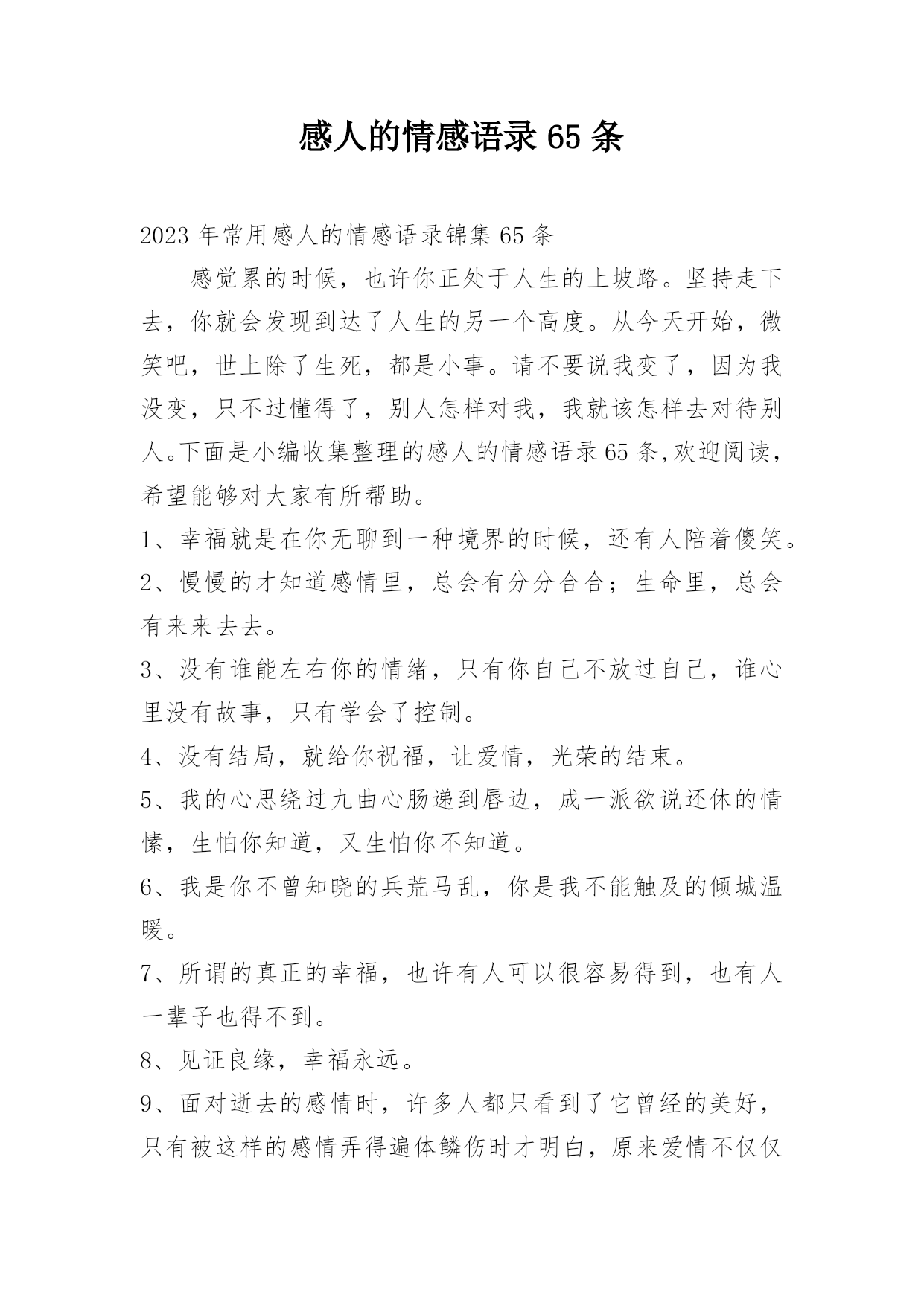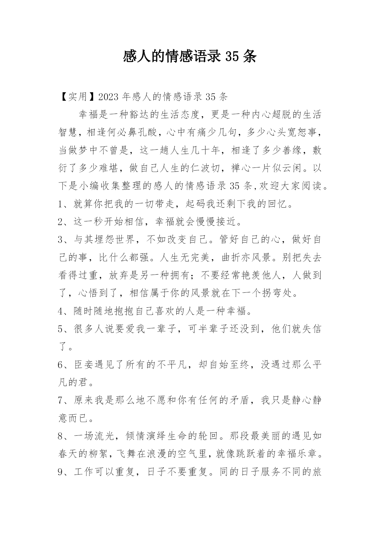 感人的情感语录35条【实用】2023年感人的情感语录35条幸福是一种豁达的生活态度,更是一种内心超脱的生活智慧,相逢何必鼻孔酸,心中有痛少几句,多少心头宽恕事,当做梦中不曾是,这一趟人生几十年,相逢了多少善缘,敷衍了多少难堪,做自己人生的仁波切,禅心一片似云闲。以下是小编收集整理的感人的情感语录35条,欢迎大家阅读。1、就算你把我的一切带走,起码我还剩下我的回忆。2、这一秒开始相信,幸福就会慢慢接近。3、与其埋怨世界,不如改变自己。管好自己的心,做好自己的事,比什么都强。人生无完美,曲折亦风景。别把失去看