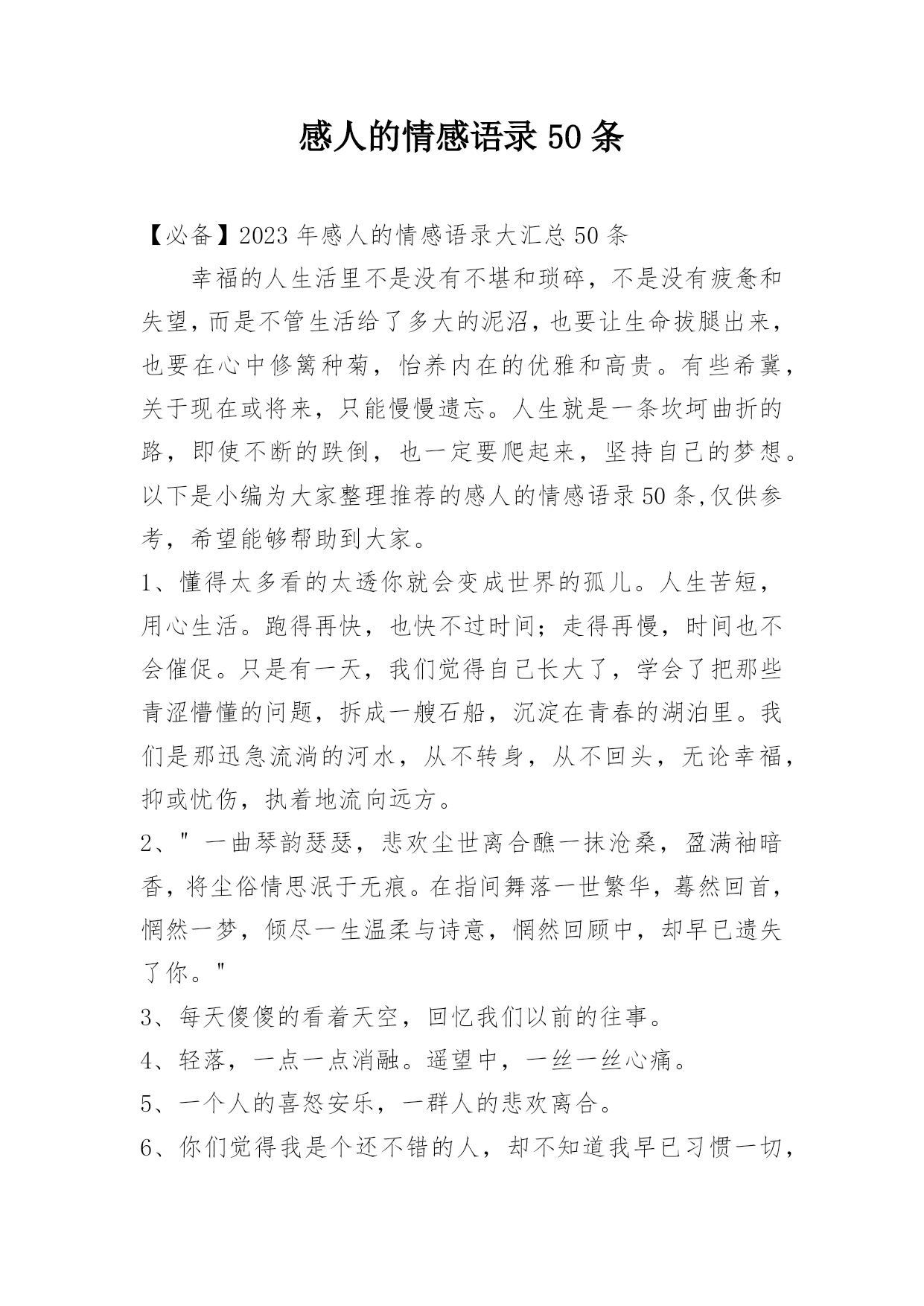 感人的情感语录50条【必备】2023年感人的情感语录大汇总50条幸福的人生活里不是没有不堪和琐碎,不是没有疲惫和失望,而是不管生活给了多大的泥沼,也要让生命拔腿出来,也要在心中修篱种菊,怡养内在的优雅和高贵。有些希冀,关于现在或将来,只能慢慢遗忘。人生就是一条坎坷曲折的路,即使不断的跌倒,也一定要爬起来,坚持自己的梦想。以下是小编为大家整理推荐的感人的情感语录50条,仅供参考,希望能够帮助到大家。1、懂得太多看的太透你就会变成世界的孤儿。人生苦短,用心生活。跑得再快,也快不过时间;走得再慢,时间也不会催促