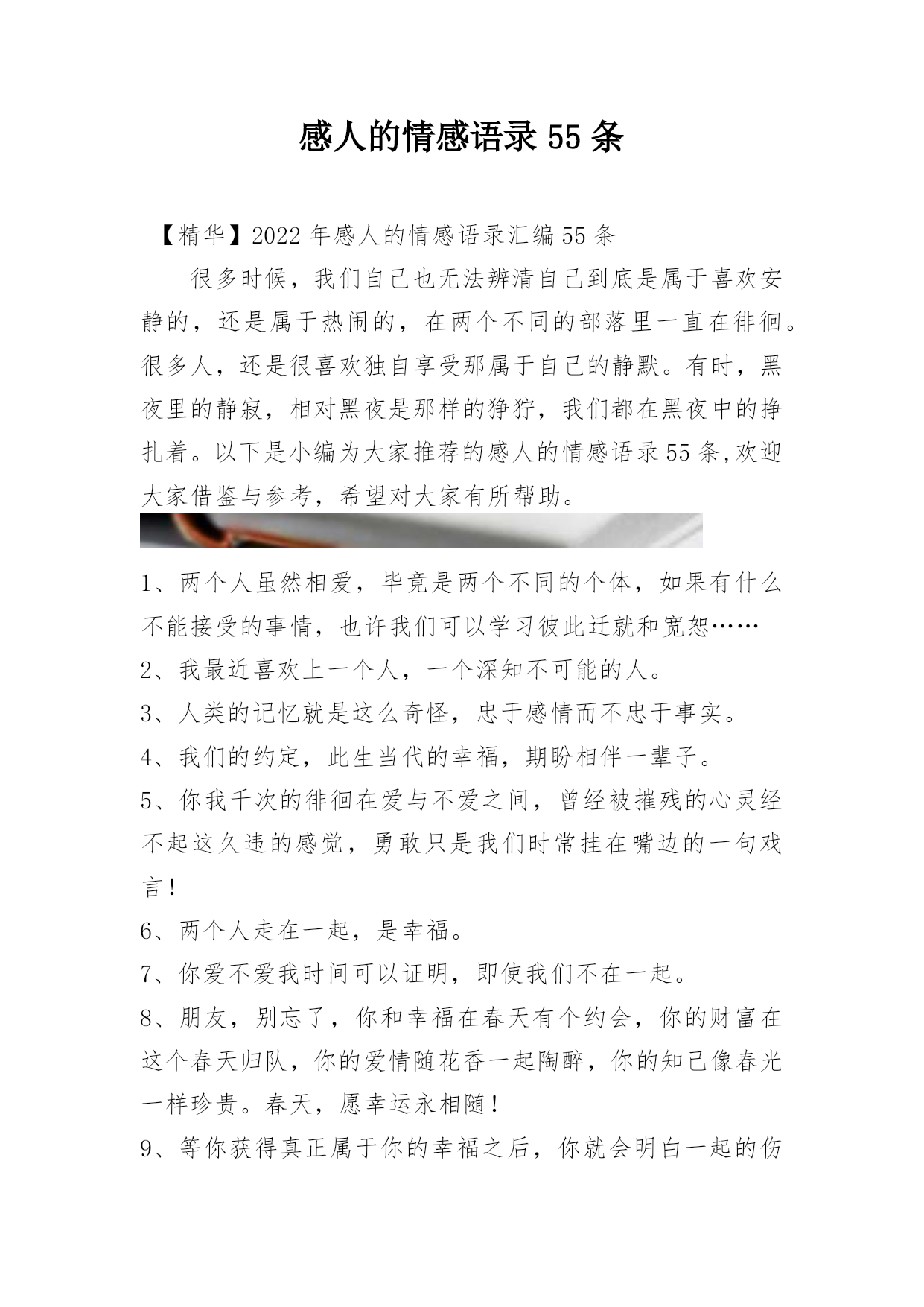 感人的情感语录55条【精华】2022年感人的情感语录汇编55条很多时候,我们自己也无法辨清自己到底是属于喜欢安静的,还是属于热闹的,在两个不同的部落里一直在徘徊。很多人,还是很喜欢独自享受那属于自己的静默。有时,黑夜里的静寂,相对黑夜是那样的狰狞,我们都在黑夜中的挣扎着。以下是小编为大家推荐的感人的情感语录55条,欢迎大家借鉴与参考,希望对大家有所帮助。1、两个人虽然相爱,毕竟是两个不同的个体,如果有什么不能接受的事情,也许我们可以学习彼此迁就和宽恕……2、我最近喜欢上一个人,一个深知不可能的人。3、人类