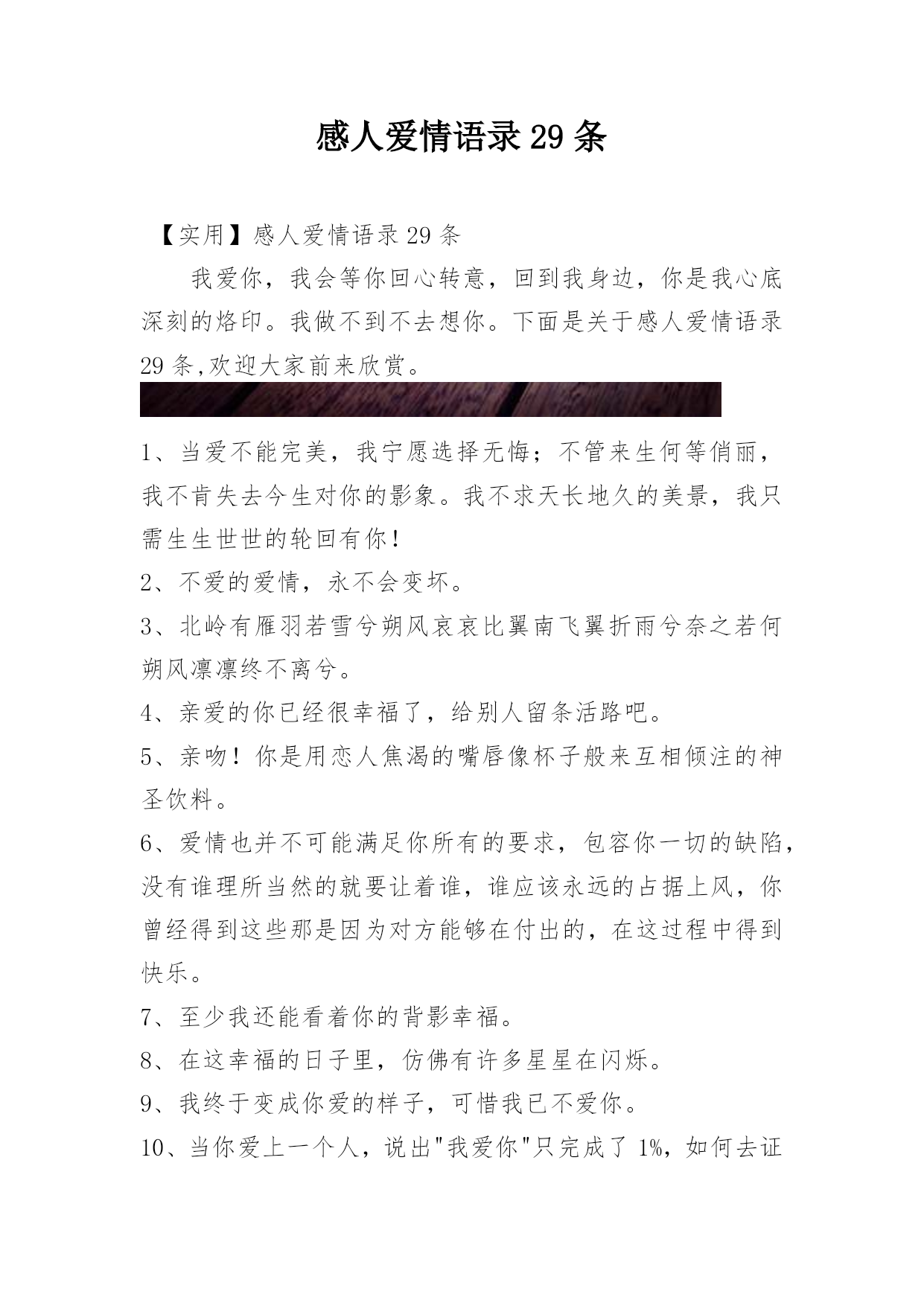 感人爱情语录29条【实用】感人爱情语录29条我爱你,我会等你回心转意,回到我身边,你是我心底深刻的烙印。我做不到不去想你。下面是关于感人爱情语录29条,欢迎大家前来欣赏。1、当爱不能完美,我宁愿选择无悔;不管来生何等俏丽,我不肯失去今生对你的影象。我不求天长地久的美景,我只需生生世世的轮回有你!2、不爱的爱情,永不会变坏。3、北岭有雁羽若雪兮朔风哀哀比翼南飞翼折雨兮奈之若何朔风凛凛终不离兮。4、亲爱的你已经很幸福了,给别人留条活路吧。5、亲吻!你是用恋人焦渴的嘴唇像杯子般来互相倾注的神圣饮料。6、爱情也并