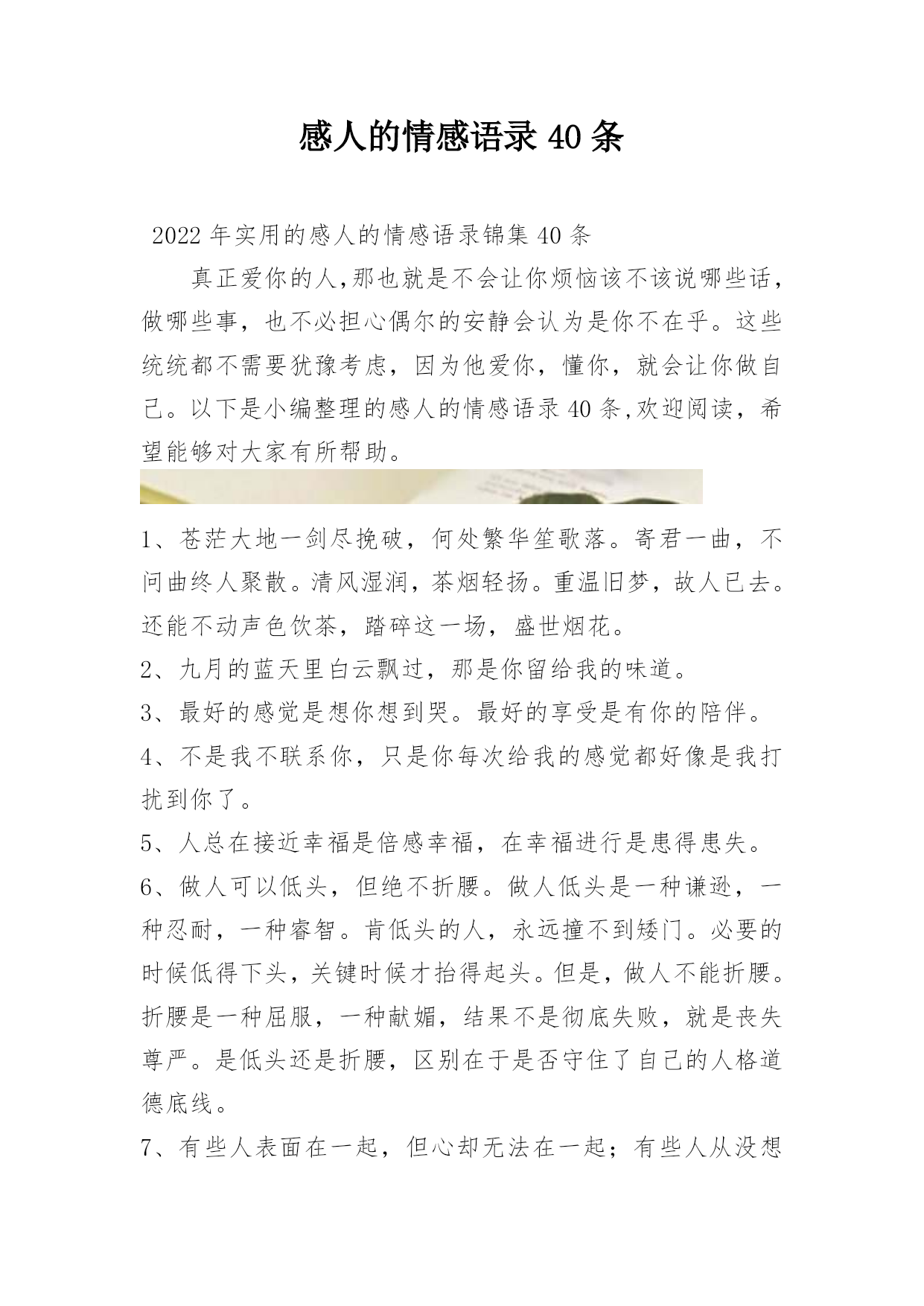感人的情感语录40条2022年实用的感人的情感语录锦集40条真正爱你的人,那也就是不会让你烦恼该不该说哪些话,做哪些事,也不必担心偶尔的安静会认为是你不在乎。这些统统都不需要犹豫考虑,因为他爱你,懂你,就会让你做自己。以下是小编整理的感人的情感语录40条,欢迎阅读,希望能够对大家有所帮助。1、苍茫大地一剑尽挽破,何处繁华笙歌落。寄君一曲,不问曲终人聚散。清风湿润,茶烟轻扬。重温旧梦,故人已去。还能不动声色饮茶,踏碎这一场,盛世烟花。2、九月的蓝天里白云飘过,那是你留给我的味道。3、最好的感觉是想你想到哭。