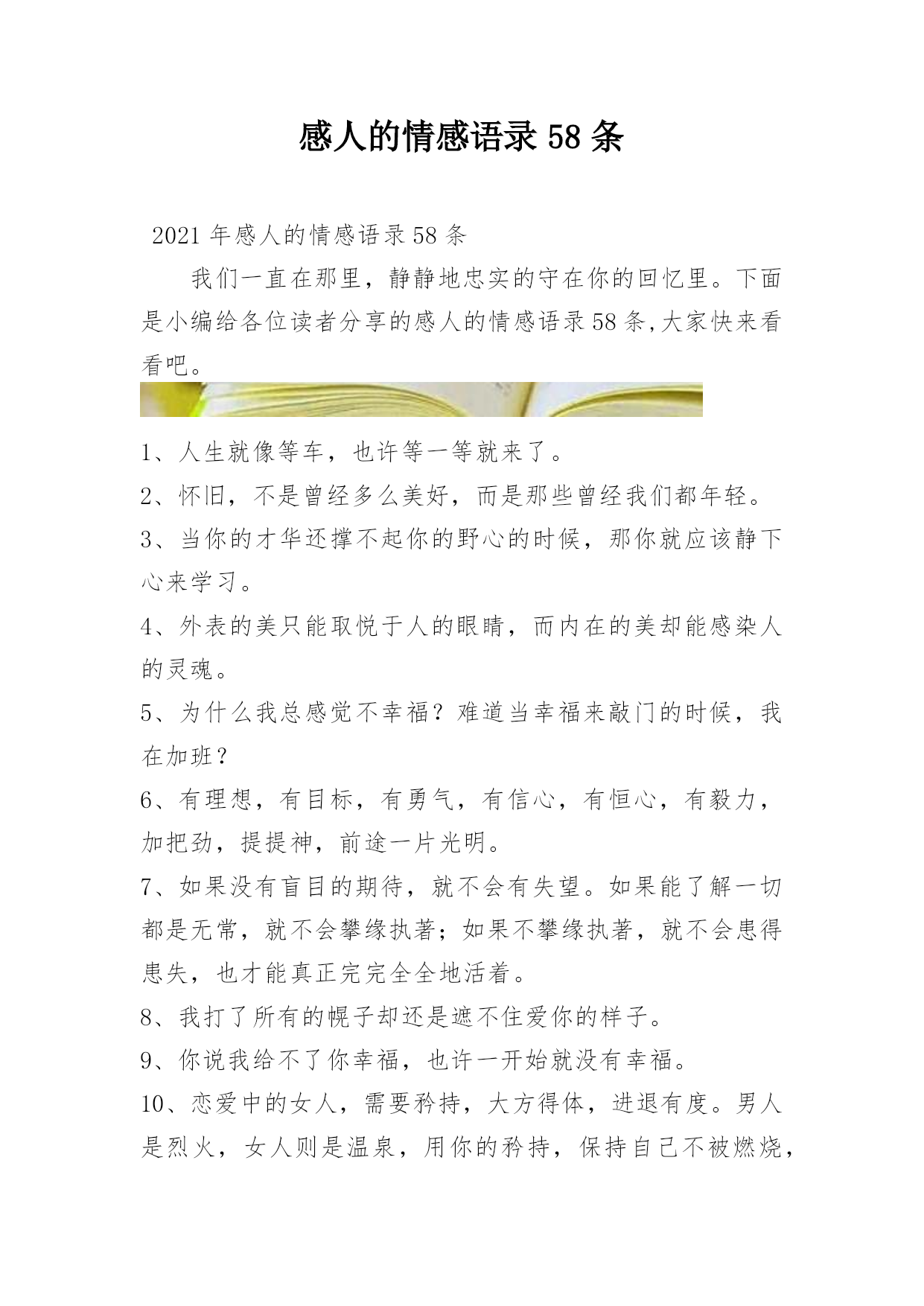 感人的情感语录58条2021年感人的情感语录58条我们一直在那里,静静地忠实的守在你的回忆里。下面是小编给各位读者分享的感人的情感语录58条,大家快来看看吧。1、人生就像等车,也许等一等就来了。2、怀旧,不是曾经多么美好,而是那些曾经我们都年轻。3、当你的才华还撑不起你的野心的时候,那你就应该静下心来学习。4、外表的美只能取悦于人的眼睛,而内在的美却能感染人的灵魂。5、为什么我总感觉不幸福?难道当幸福来敲门的时候,我在加班?6、有理想,有目标,有勇气,有信心,有恒心,有毅力,加把劲,提提神,前途一片光明。