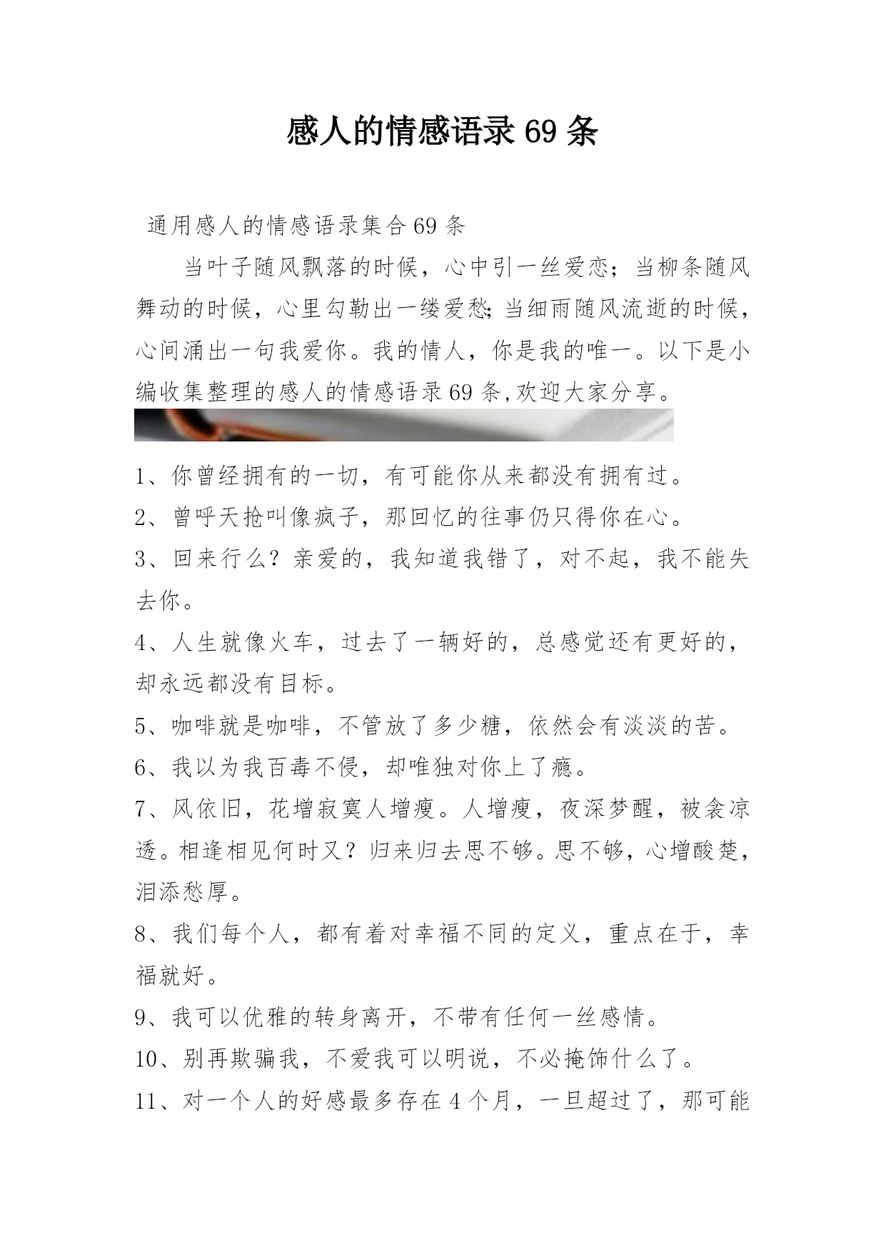 感人的情感语录69条通用感人的情感语录集合69条当叶子随风飘落的时候,心中引一丝爱恋;当柳条随风舞动的时候,心里勾勒出一缕爱愁;当细雨随风流逝的时候,心间涌出一句我爱你。我的情人,你是我的唯一。以下是小编收集整理的感人的情感语录69条,欢迎大家分享。1、你曾经拥有的一切,有可能你从来都没有拥有过。2、曾呼天抢叫像疯子,那回忆的往事仍只得你在心。3、回来行么?亲爱的,我知道我错了,对不起,我不能失去你。4、人生就像火车,过去了一辆好的,总感觉还有更好的,却永远都没有目标。5、咖啡就是咖啡,不管放了多少糖,依