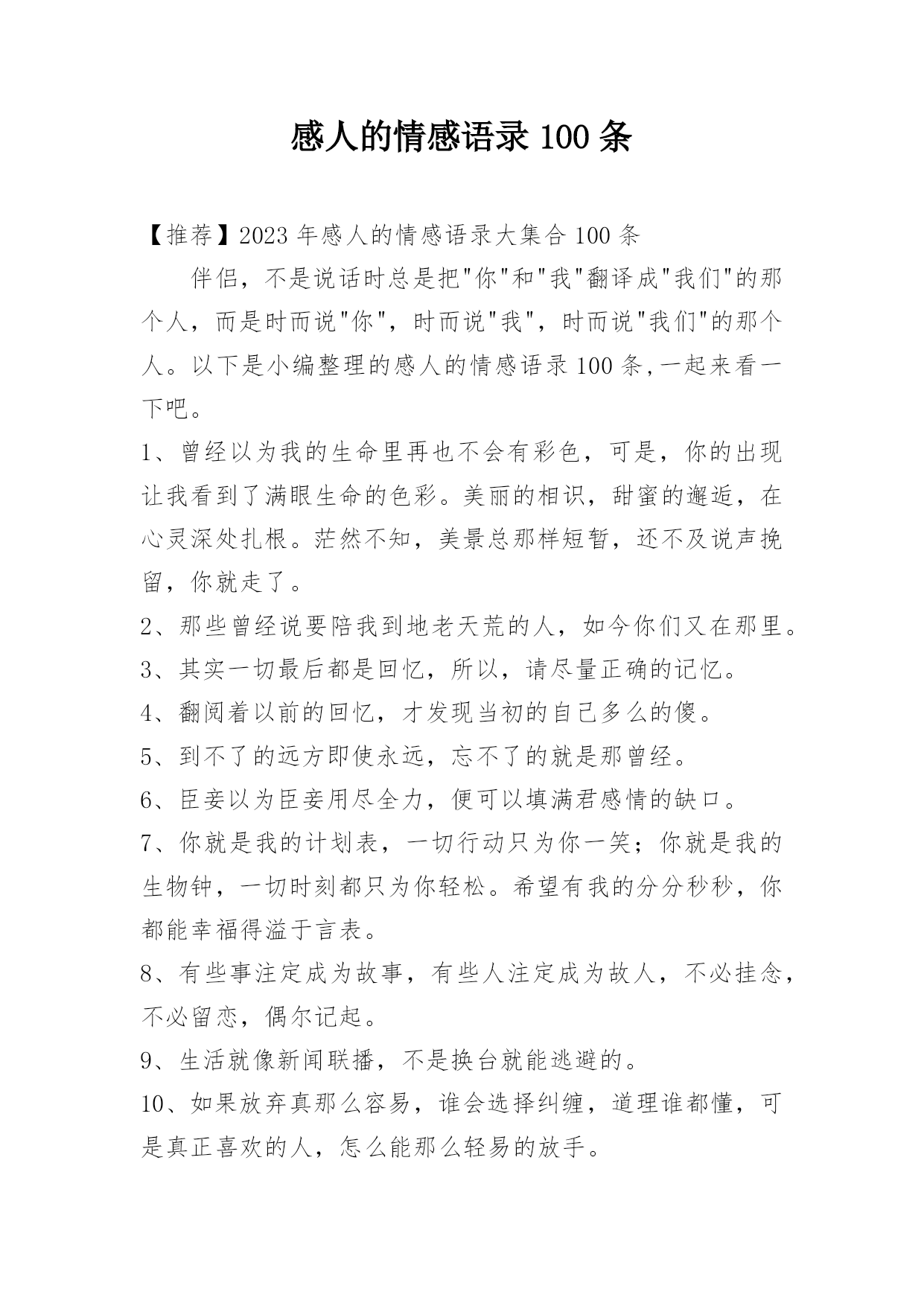 感人的情感语录100条【推荐】2023年感人的情感语录大集合100条伴侣,不是说话时总是把"你"和"我"翻译成"我们"的那个人,而是时而说"你",时而说"我",时而说"我们"的那个人。以下是小编整理的感人的情感语录100条,一起来看一下吧。1、曾经以为我的生命里再也不会有彩色,可是,你的出现让我看到了满眼生命的色彩。美丽的相识,甜蜜的邂逅,在心灵深处扎根。茫然不知,美景总那样短暂,还不及说声挽留,你就走了。2、那些曾经说要陪我到地老天荒的人,如今你们又在那里。3、其实一切最后都是回忆,所以,请尽量正确的记
