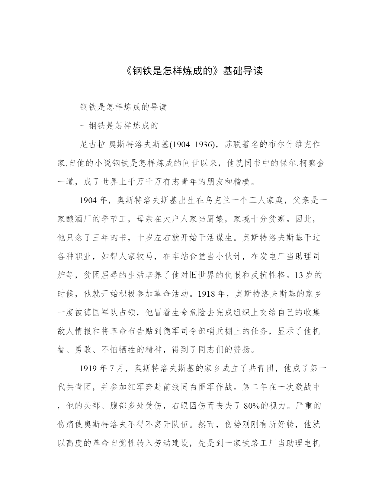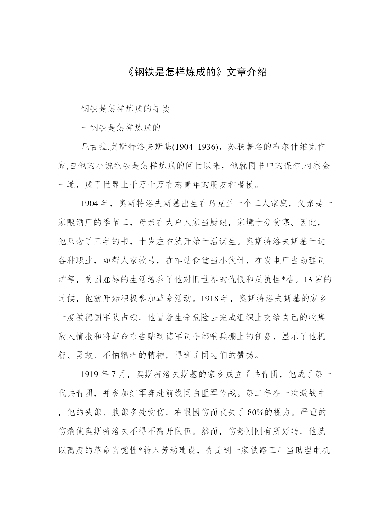 《钢铁是怎样炼成的》文章介绍钢铁是怎样炼成的导读一钢铁是怎样炼成的尼古拉.奥斯特洛夫斯基(1904_1936),苏联著名的布尔什维克作家,自他的小说钢铁是怎样炼成的问世以来,他就同书中的保尔.柯察金一道,成了世界上千万千万有志青年的朋友和楷模。1904年,奥斯特洛夫斯基出生在乌克兰一个工人家庭,父亲是一家酿酒厂的季节工,母亲在大户人家当厨娘,家境十分贫寒。因此,他只念了三年的书,十岁左右就开始干活谋生。奥斯特洛夫斯基干过各种职业,如帮人家牧马,在车站食堂当小伙计,在发电厂当助理司炉等,贫困屈辱的生活培养了