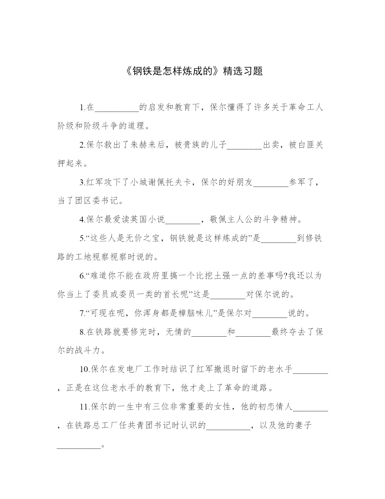 《钢铁是怎样炼成的》精选习题1.在__________的启发和教育下,保尔懂得了许多关于革命工人阶级和阶级斗争的道理。2.保尔救出了朱赫来后,被贵族的儿子________出卖,被白匪关押起来。3.红军攻下了小城谢佩托夫卡,保尔的好朋友________参军了,当了团区委书记。4.保尔最爱读英国小说________,敬佩主人公的斗争精神。5.“这些人是无价之宝,钢铁就是这样炼成的”是________到修铁路的工地视察视察时说的。6.“难道你不能在政府里搞一个比挖土强一点的差事吗?我还以为你当上了委员或委员一类