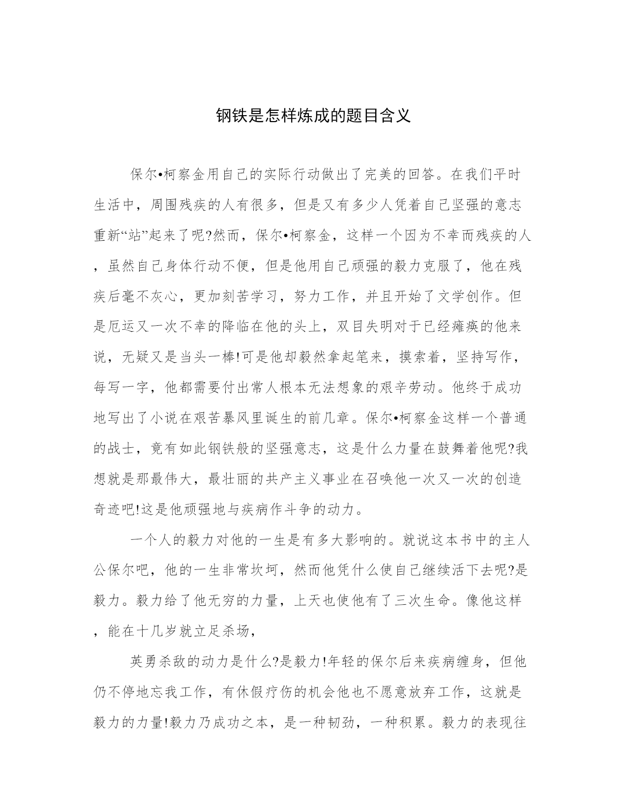 钢铁是怎样炼成的题目含义保尔•柯察金用自己的实际行动做出了完美的回答。在我们平时生活中,周围残疾的人有很多,但是又有多少人凭着自己坚强的意志重新“站”起来了呢?然而,保尔•柯察金,这样一个因为不幸而残疾的人,虽然自己身体行动不便,但是他用自己顽强的毅力克服了,他在残疾后毫不灰心,更加刻苦学习,努力工作,并且开始了文学创作。但是厄运又一次不幸的降临在他的头上,双目失明对于已经瘫痪的他来说,无疑又是当头一棒!可是他却毅然拿起笔来,摸索着,坚持写作,每写一字,他都需要付出常人根本无法想象的艰辛劳动。他终于成功地