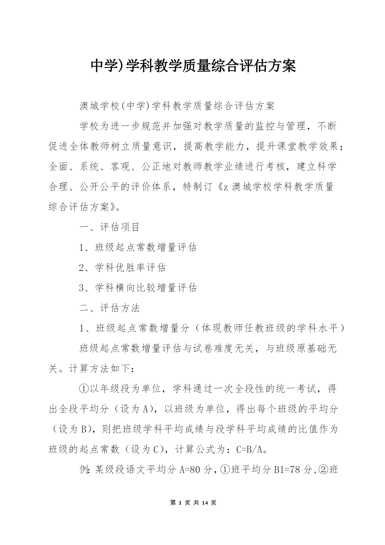 第PAGE\*MERGEFORMAT14页共NUMPAGES\*MERGEFORMAT14页中学)学科教学质量综合评估方案澳城学校(中学)学科教学质量综合评估方案学校为进一步规范并加强对教学质量的监控与管理,不断促进全体教师树立质量意识,提高教学能力,提升课堂教学效果;全面、系统、客观、公正地对教师教学业绩进行考核,建立科学合理、公开公平的评价体系,特制订《z澳城学校学科教学质量综合评估方案》。一、评估项目1、班级起点常数增量评估2、学科优胜率评估3、学科横向比较增量评估二、评估方法1、班级起