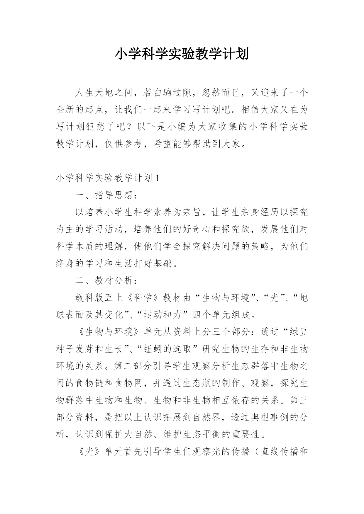 小学科学实验教学计划人生天地之间,若白驹过隙,忽然而已,又迎来了一个全新的起点,让我们一起来学习写计划吧。相信大家又在为写计划犯愁了吧?以下是小编为大家收集的小学科学实验教学计划,仅供参考,希望能够帮助到大家。小学科学实验教学计划1一、指导思想:以培养小学生科学素养为宗旨,让学生亲身经历以探究为主的学习活动,培养他们的好奇心和探究欲,发展他们对科学本质的理解,使他们学会探究解决问题的策略,为他们终身的学习和生活打好基础。二、教材分析:教科版五上《科学》教材由“生物与环境”、“光”、“地球表面及其变化”、“