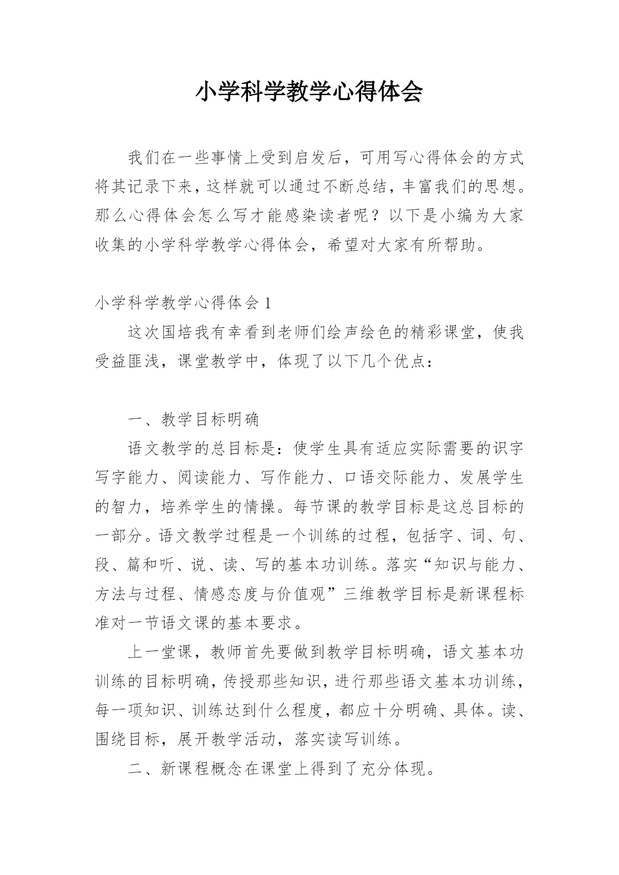 小学科学教学心得体会我们在一些事情上受到启发后,可用写心得体会的方式将其记录下来,这样就可以通过不断总结,丰富我们的思想。那么心得体会怎么写才能感染读者呢?以下是小编为大家收集的小学科学教学心得体会,希望对大家有所帮助。小学科学教学心得体会1这次国培我有幸看到老师们绘声绘色的精彩课堂,使我受益匪浅,课堂教学中,体现了以下几个优点:一、教学目标明确语文教学的总目标是:使学生具有适应实际需要的识字写字能力、阅读能力、写作能力、口语交际能力、发展学生的智力,培养学生的情操。每节课的教学目标是这总目标的一部分。语