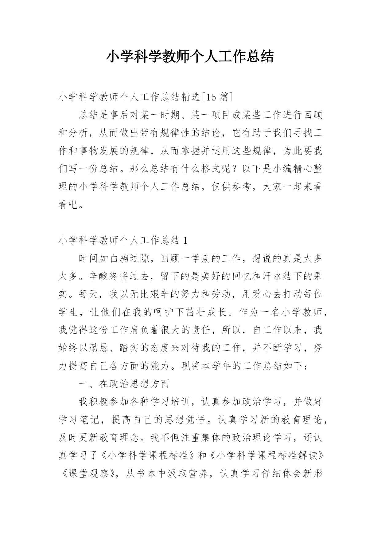 小学科学教师个人工作总结小学科学教师个人工作总结精选[15篇]总结是事后对某一时期、某一项目或某些工作进行回顾和分析,从而做出带有规律性的结论,它有助于我们寻找工作和事物发展的规律,从而掌握并运用这些规律,为此要我们写一份总结。那么总结有什么格式呢?以下是小编精心整理的小学科学教师个人工作总结,仅供参考,大家一起来看看吧。小学科学教师个人工作总结1时间如白驹过隙,回顾一学期的工作,想说的真是太多太多。辛酸终将过去,留下的是美好的回忆和汗水结下的果实。每天,我以无比艰辛的努力和劳动,用爱心去打动每位学生,让