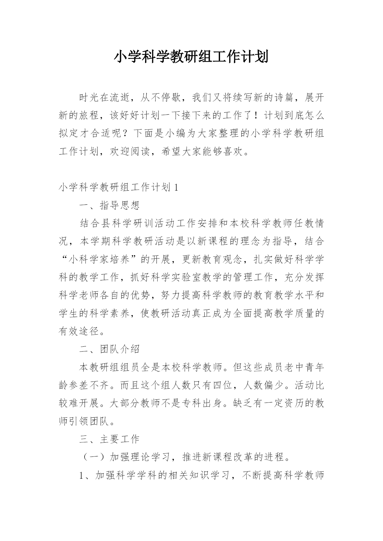 小学科学教研组工作计划时光在流逝,从不停歇,我们又将续写新的诗篇,展开新的旅程,该好好计划一下接下来的工作了!计划到底怎么拟定才合适呢?下面是小编为大家整理的小学科学教研组工作计划,欢迎阅读,希望大家能够喜欢。小学科学教研组工作计划1一、指导思想结合县科学研训活动工作安排和本校科学教师任教情况,本学期科学教研活动是以新课程的理念为指导,结合“小科学家培养”的开展,更新教育观念,扎实做好科学学科的教学工作,抓好科学实验室教学的管理工作,充分发挥科学老师各自的优势,努力提高科学教师的教育教学水平和学生的科学素