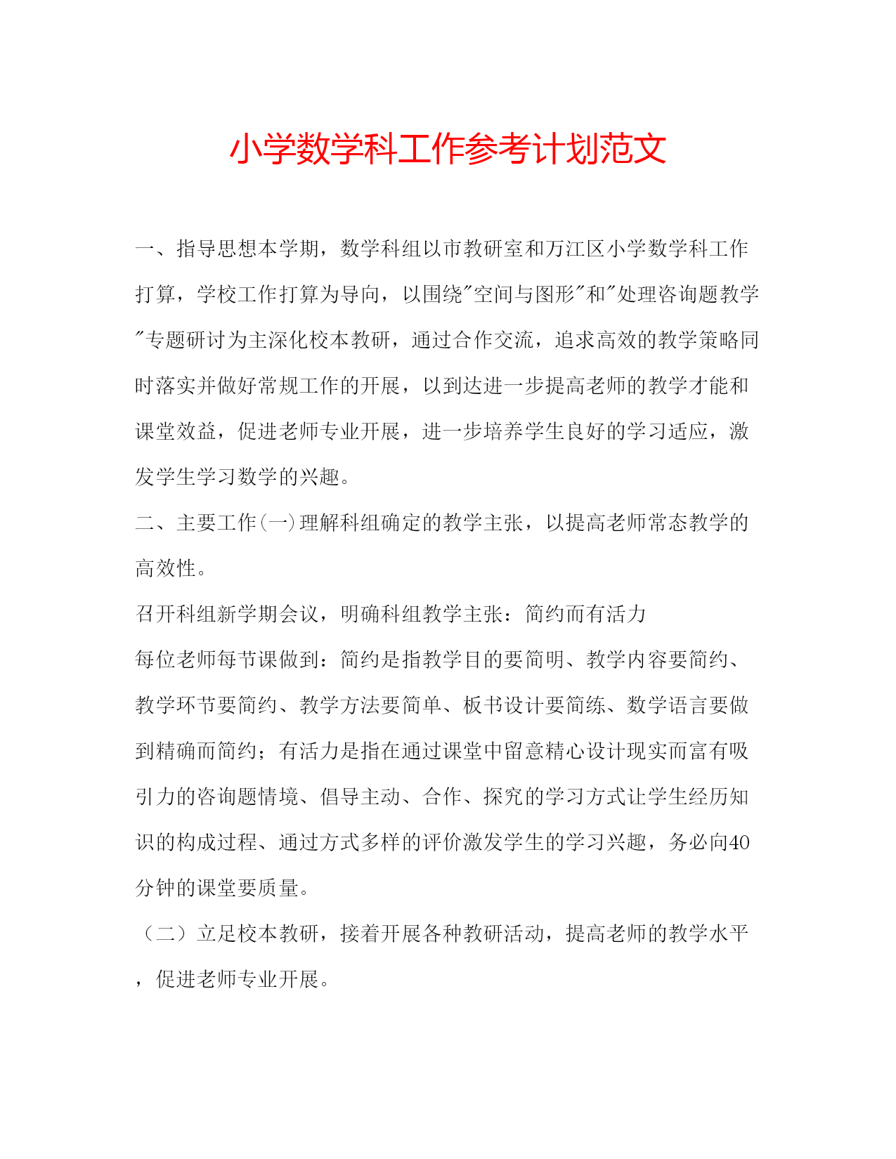 小学数学科工作参考计划范文一、指导思想本学期,数学科组以市教研室和万江区小学数学科工作打算,学校工作打算为导向,以围绕"空间与图形"和"处理咨询题教学"专题研讨为主深化校本教研,通过合作交流,追求高效的教学策略同时落实并做好常规工作的开展,以到达进一步提高老师的教学才能和课堂效益,促进老师专业开展,进一步培养学生良好的学习适应,激发学生学习数学的兴趣。二、主要工作(一)理解科组确定的教学主张,以提高老师常态教学的高效性。召开科组新学期会议,明确科组教学主张:简约而有活力每位老师每节课做到:简约是指教学目的