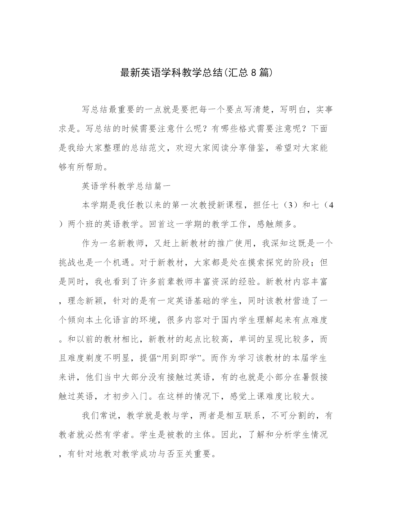 最新英语学科教学总结(汇总8篇)写总结最重要的一点就是要把每一个要点写清楚,写明白,实事求是。写总结的时候需要注意什么呢?有哪些格式需要注意呢?下面是我给大家整理的总结范文,欢迎大家阅读分享借鉴,希望对大家能够有所帮助。英语学科教学总结篇一本学期是我任教以来的第一次教授新课程,担任七(3)和七(4)两个班的英语教学。回首这一学期的教学工作,感触颇多。作为一名新教师,又赶上新教材的推广使用,我深知这既是一个挑战也是一个机遇。对于新教材,大家都是处在摸索探究的阶段;但是同时,我也看到了许多前辈教师丰富资深的经