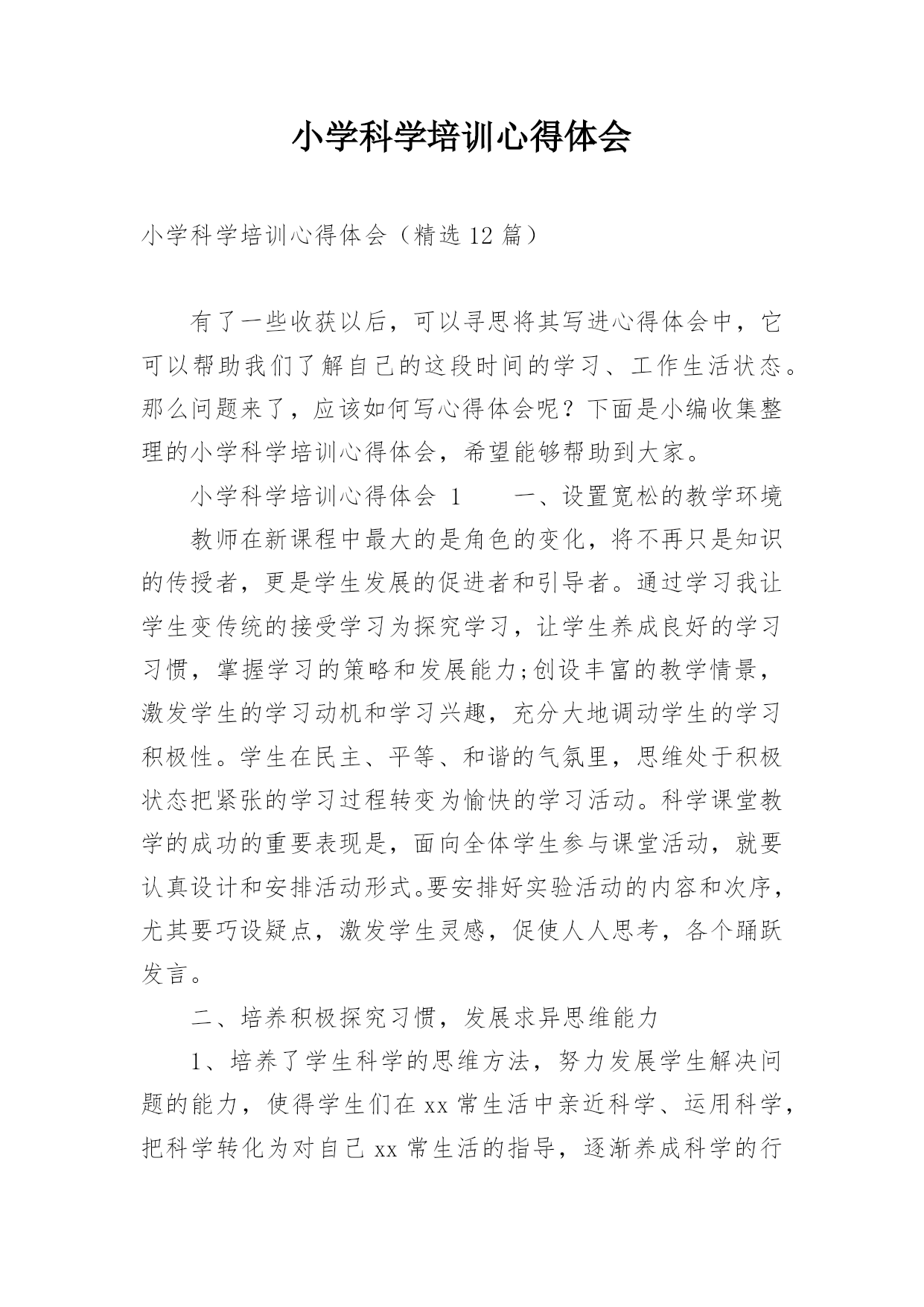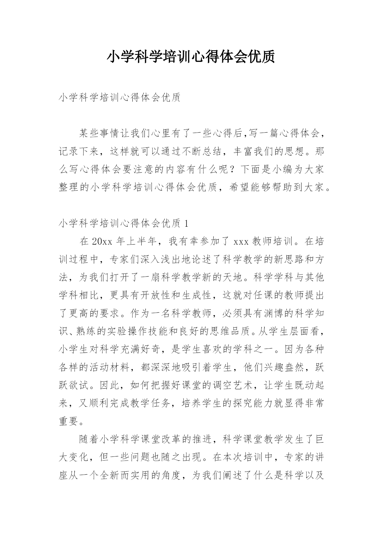小学科学培训心得体会优质小学科学培训心得体会优质某些事情让我们心里有了一些心得后,写一篇心得体会,记录下来,这样就可以通过不断总结,丰富我们的思想。那么写心得体会要注意的内容有什么呢?下面是小编为大家整理的小学科学培训心得体会优质,希望能够帮助到大家。小学科学培训心得体会优质1在20xx年上半年,我有幸参加了xxx教师培训。在培训过程中,专家们深入浅出地论述了科学教学的新思路和方法,为我们打开了一扇科学教学新的天地。科学学科与其他学科相比,更具有开放性和生成性,这就对任课的教师提出了更高的要求。作为一名科