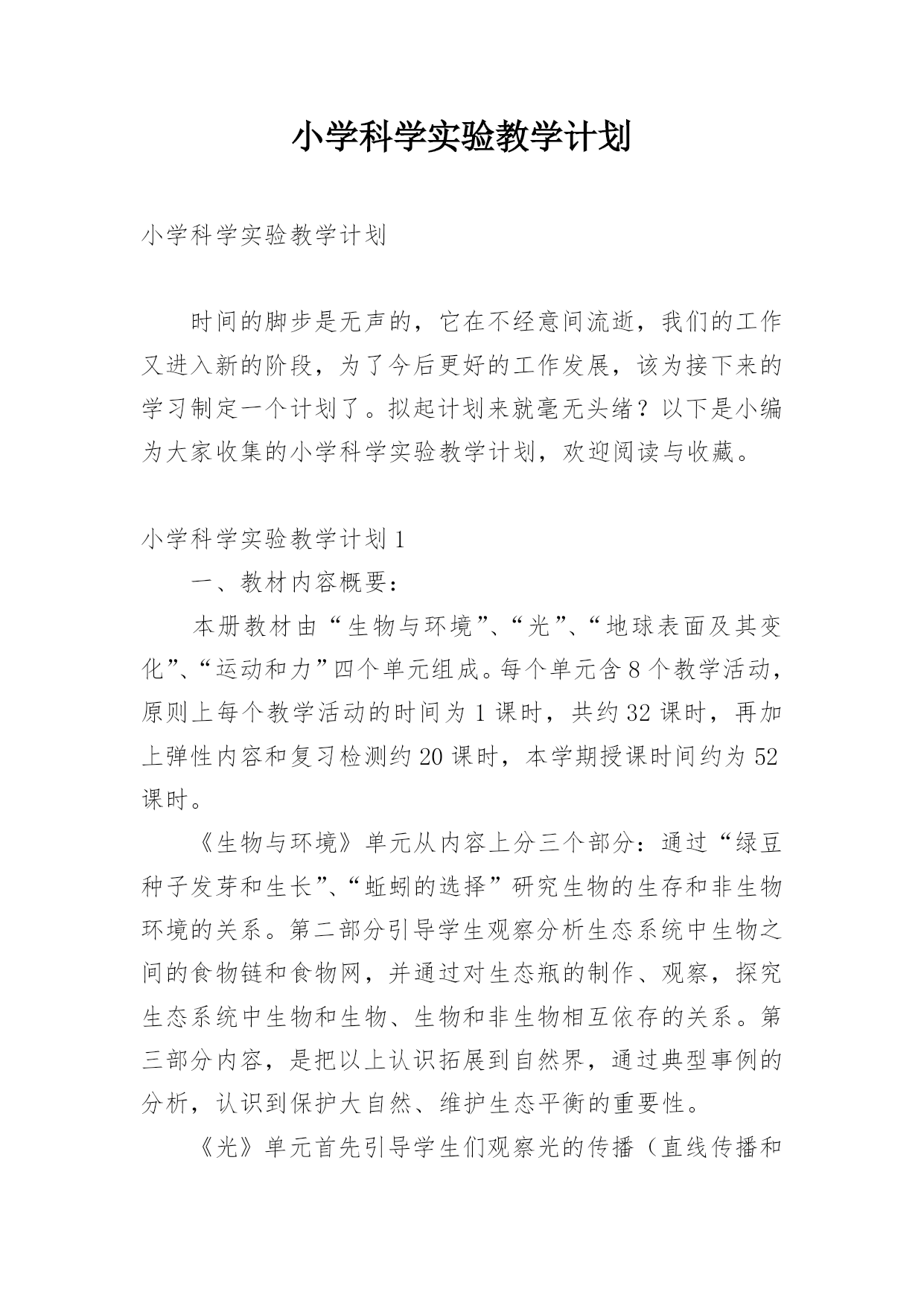 小学科学实验教学计划小学科学实验教学计划时间的脚步是无声的,它在不经意间流逝,我们的工作又进入新的阶段,为了今后更好的工作发展,该为接下来的学习制定一个计划了。拟起计划来就毫无头绪?以下是小编为大家收集的小学科学实验教学计划,欢迎阅读与收藏。小学科学实验教学计划1一、教材内容概要:本册教材由“生物与环境”、“光”、“地球表面及其变化”、“运动和力”四个单元组成。每个单元含8个教学活动,原则上每个教学活动的时间为1课时,共约32课时,再加上弹性内容和复习检测约20课时,本学期授课时间约为52课时。《生物与环