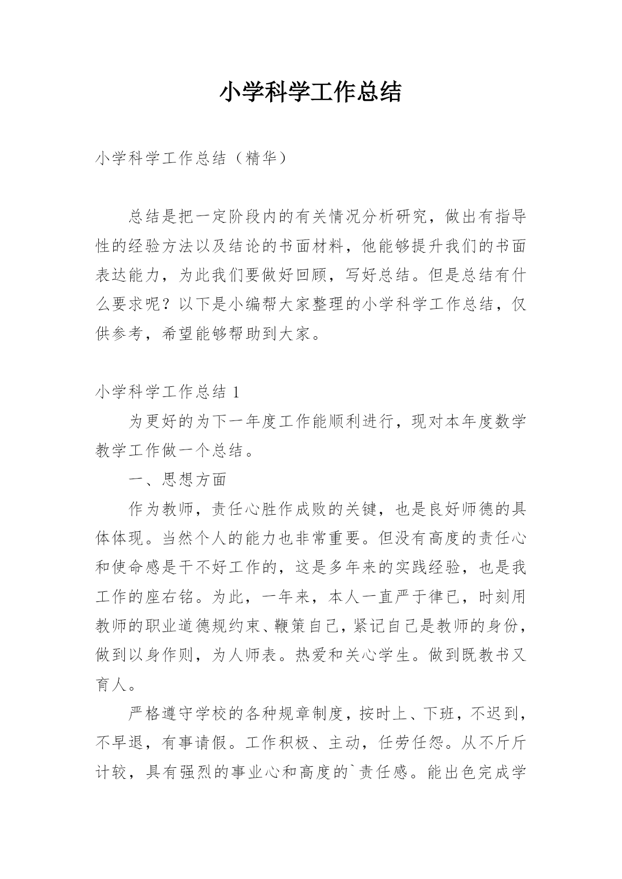 小学科学工作总结小学科学工作总结(精华)总结是把一定阶段内的有关情况分析研究,做出有指导性的经验方法以及结论的书面材料,他能够提升我们的书面表达能力,为此我们要做好回顾,写好总结。但是总结有什么要求呢?以下是小编帮大家整理的小学科学工作总结,仅供参考,希望能够帮助到大家。小学科学工作总结1为更好的为下一年度工作能顺利进行,现对本年度数学教学工作做一个总结。一、思想方面作为教师,责任心胜作成败的关键,也是良好师德的具体体现。当然个人的能力也非常重要。但没有高度的责任心和使命感是干不好工作的,这是多年来的实践