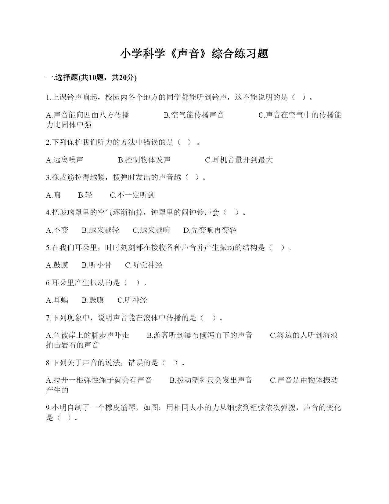 小学科学《声音》综合练习题一.选择题(共10题,共20分)1.上课铃声响起,校园内各个地方的同学都能听到铃声,这不能说明的是()。A.声音能向四面八方传播B.空气能传播声音C.声音在空气中的传播能力比固体中强2.下列保护我们听力的方法中错误的是()。A.远离噪声B.控制物体发声C.耳机音量开到最大3.橡皮筋拉得越紧,拨弹时发出的声音越()。A.响B.轻C.不一定听到4.把玻璃罩里的空气逐渐抽掉,钟罩里的闹钟铃声会()。A.不变B.越来越轻C.越来越响D.先变响再变轻5.在我们耳朵里,时时刻刻都在接收各种声