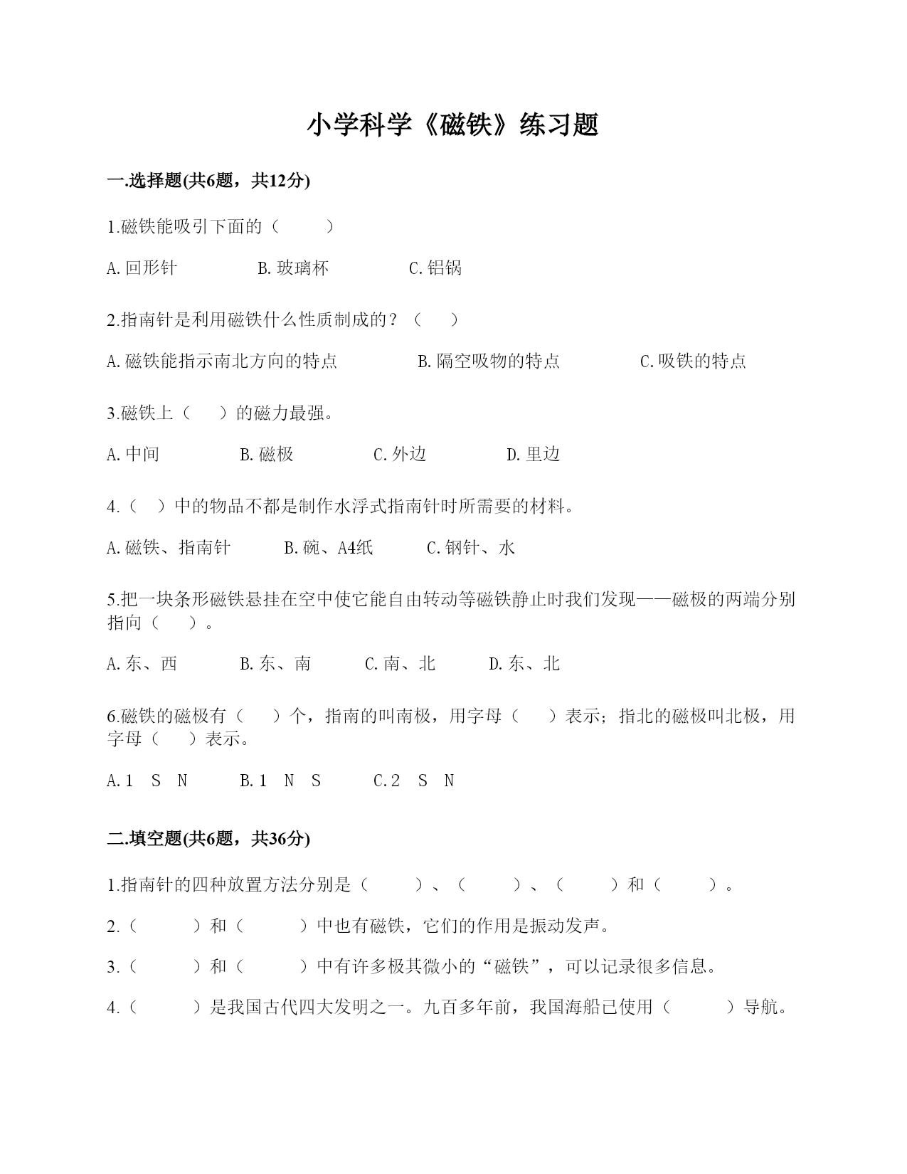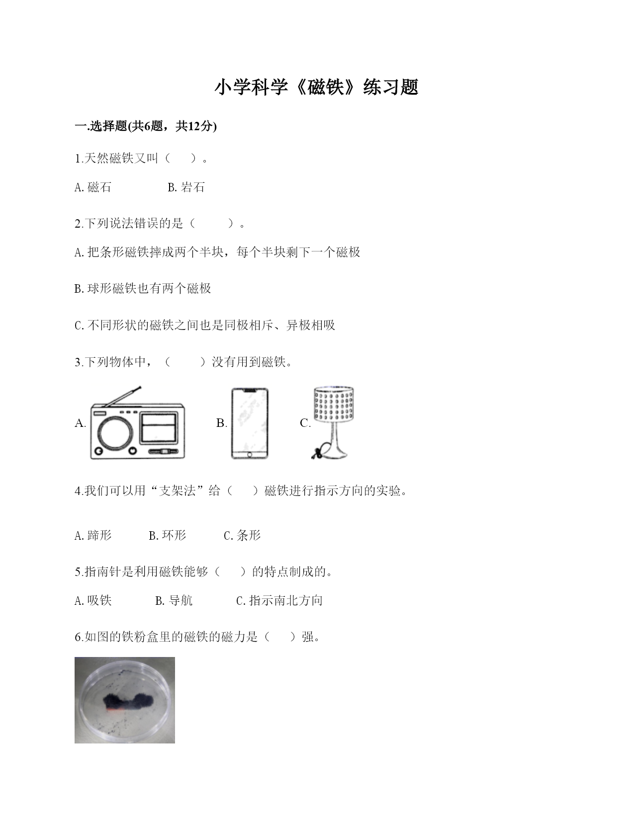 小学科学《磁铁》练习题一.选择题(共6题,共12分)1.天然磁铁又叫()。A.磁石B.岩石2.下列说法错误的是()。A.把条形磁铁摔成两个半块,每个半块剩下一个磁极B.球形磁铁也有两个磁极C.不同形状的磁铁之间也是同极相斥、异极相吸3.下列物体中,()没有用到磁铁。A.B.C.4.我们可以用“支架法”给()磁铁进行指示方向的实验。A.蹄形B.环形C.条形5.指南针是利用磁铁能够()的特点制成的。A.吸铁B.导航C.指示南北方向6.如图的铁粉盒里的磁铁的磁力是()强。A.左端B.右端C.两端二.填空题(共6