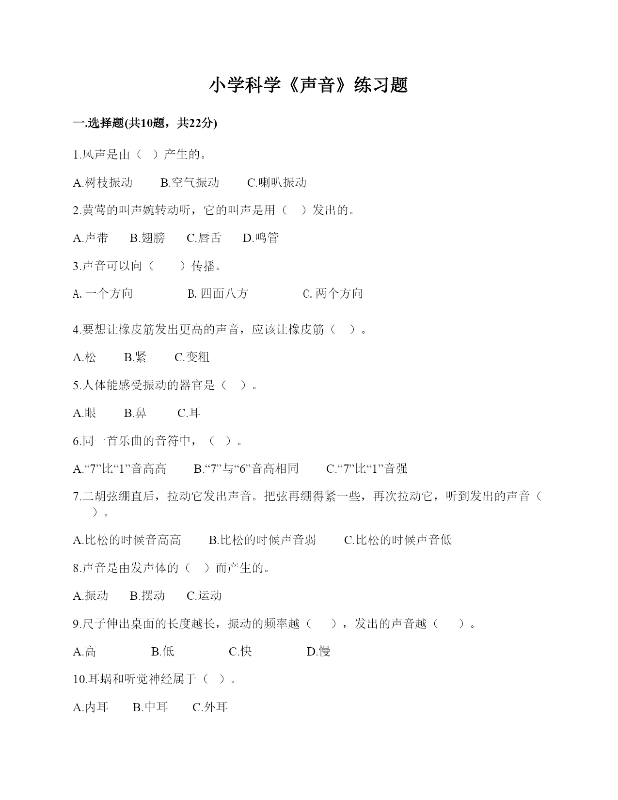 小学科学《声音》练习题一.选择题(共10题,共22分)1.风声是由()产生的。A.树枝振动B.空气振动C.喇叭振动2.黄莺的叫声婉转动听,它的叫声是用()发出的。A.声带B.翅膀C.唇舌D.鸣管3.声音可以向()传播。A.一个方向B.四面八方C.两个方向4.要想让橡皮筋发出更高的声音,应该让橡皮筋()。A.松B.紧C.变粗5.人体能感受振动的器官是()。A.眼B.鼻C.耳6.同一首乐曲的音符中,()。A.“7”比“1”音高高B.“7”与“6”音高相同C.“7”比“1”音强7.二胡弦绷直后,拉动它发出声音。