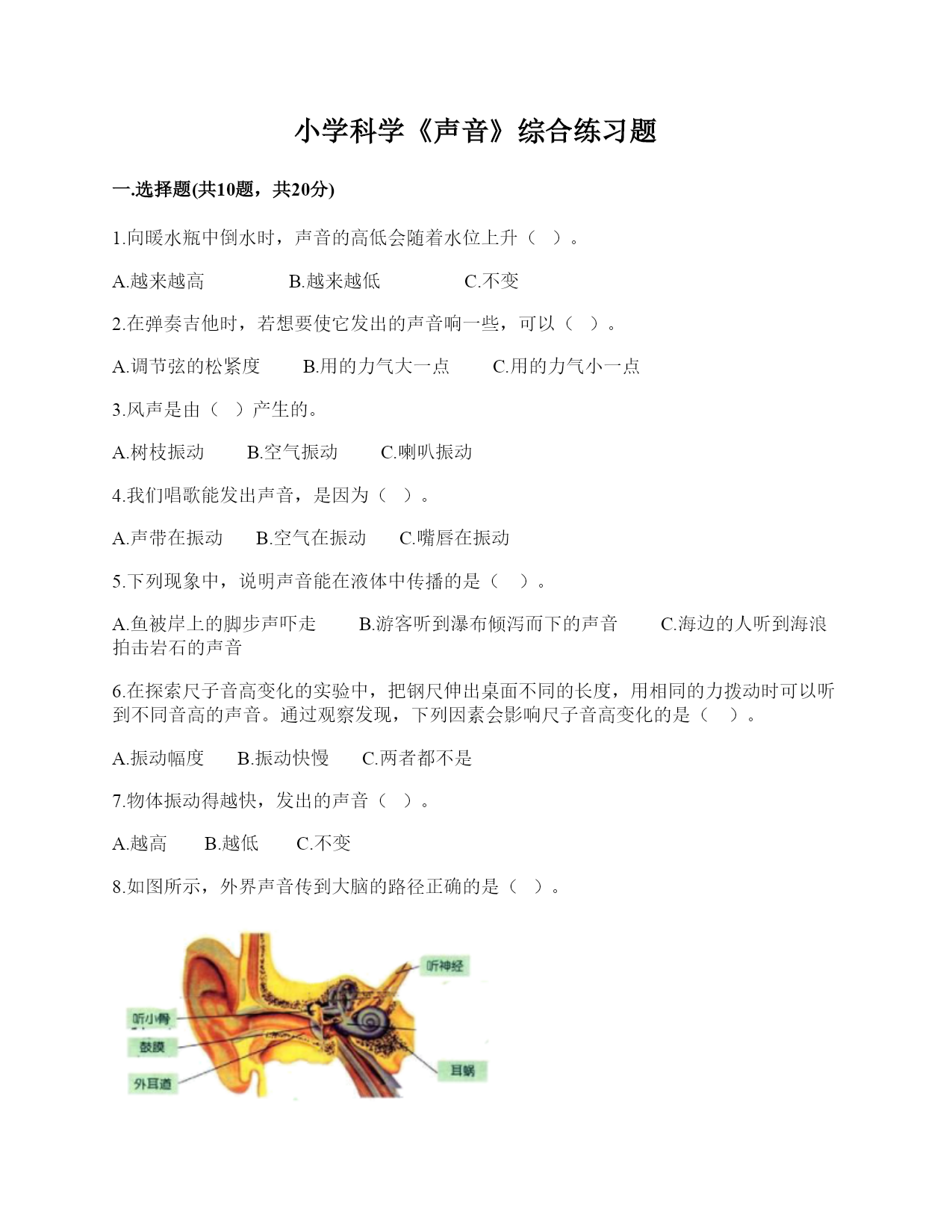 小学科学《声音》综合练习题一.选择题(共10题,共20分)1.向暖水瓶中倒水时,声音的高低会随着水位上升()。A.越来越高B.越来越低C.不变2.在弹奏吉他时,若想要使它发出的声音响一些,可以()。A.调节弦的松紧度B.用的力气大一点C.用的力气小一点3.风声是由()产生的。A.树枝振动B.空气振动C.喇叭振动4.我们唱歌能发出声音,是因为()。A.声带在振动B.空气在振动C.嘴唇在振动5.下列现象中,说明声音能在液体中传播的是()。A.鱼被岸上的脚步声吓走B.游客听到瀑布倾泻而下的声音C.海边的人听到海