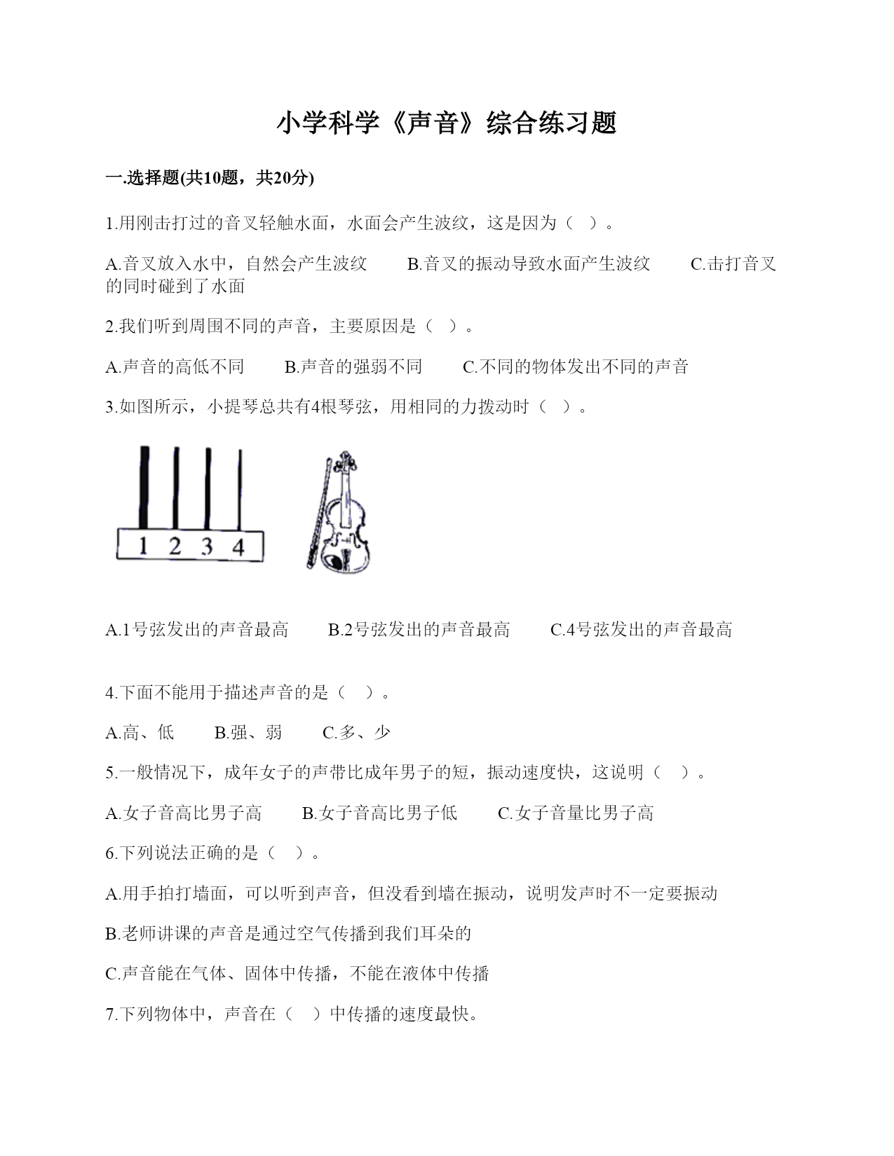 小学科学《声音》综合练习题一.选择题(共10题,共20分)1.用刚击打过的音叉轻触水面,水面会产生波纹,这是因为()。A.音叉放入水中,自然会产生波纹B.音叉的振动导致水面产生波纹C.击打音叉的同时碰到了水面2.我们听到周围不同的声音,主要原因是()。A.声音的高低不同B.声音的强弱不同C.不同的物体发出不同的声音3.如图所示,小提琴总共有4根琴弦,用相同的力拨动时()。A.1号弦发出的声音最高B.2号弦发出的声音最高C.4号弦发出的声音最高4.下面不能用于描述声音的是()。A.高、低B.强、弱C.多、少