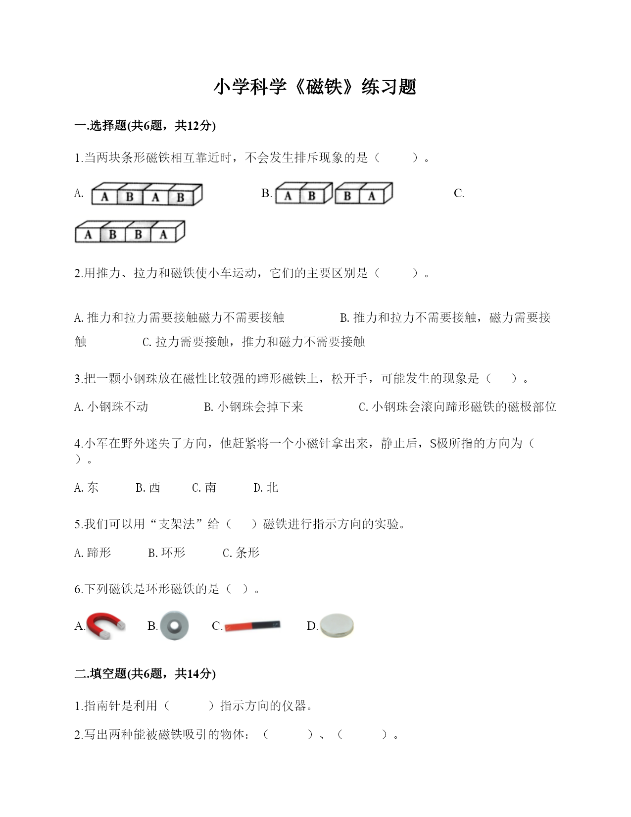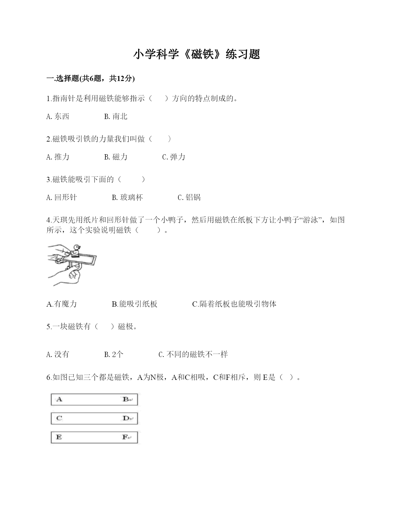 小学科学《磁铁》练习题一.选择题(共6题,共12分)1.指南针是利用磁铁能够指示()方向的特点制成的。A.东西B.南北2.磁铁吸引铁的力量我们叫做()A.推力B.磁力C.弹力3.磁铁能吸引下面的()A.回形针B.玻璃杯C.铝锅4.天琪先用纸片和回形针做了一个小鸭子,然后用磁铁在纸板下方让小鸭子“游泳”,如图所示,这个实验说明磁铁()。A.有魔力B.能吸引纸板C.隔着纸板也能吸引物体5.一块磁铁有()磁极。A.没有B.2个C.不同的磁铁不一样6.如图已知三个都是磁铁,A为N极,A和C相吸,C和F相斥,则E是