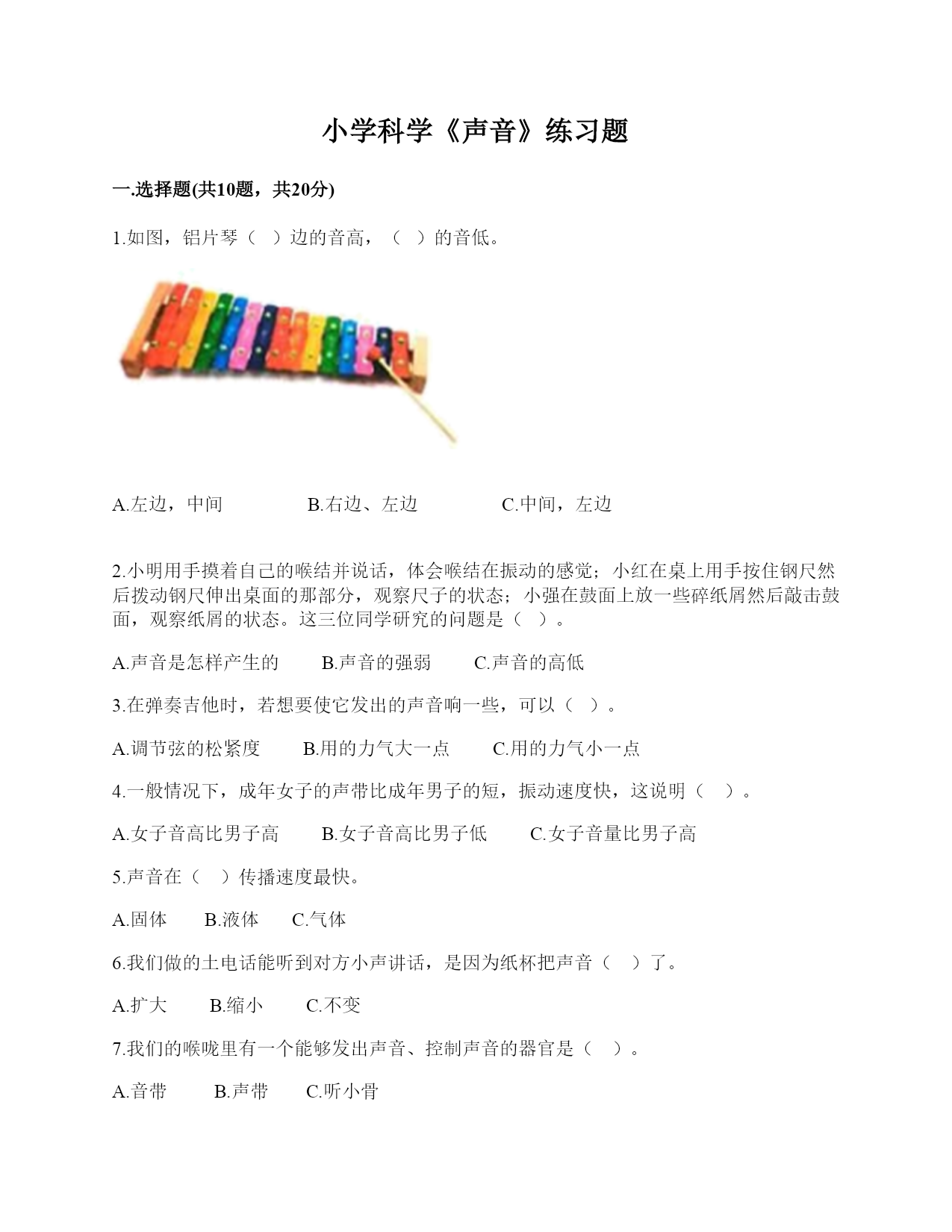 小学科学《声音》练习题一.选择题(共10题,共20分)1.如图,铝片琴()边的音高,()的音低。A.左边,中间B.右边、左边C.中间,左边2.小明用手摸着自己的喉结并说话,体会喉结在振动的感觉;小红在桌上用手按住钢尺然后拨动钢尺伸出桌面的那部分,观察尺子的状态;小强在鼓面上放一些碎纸屑然后敲击鼓面,观察纸屑的状态。这三位同学研究的问题是()。A.声音是怎样产生的B.声音的强弱C.声音的高低3.在弹奏吉他时,若想要使它发出的声音响一些,可以()。A.调节弦的松紧度B.用的力气大一点C.用的力气小一点4.一般