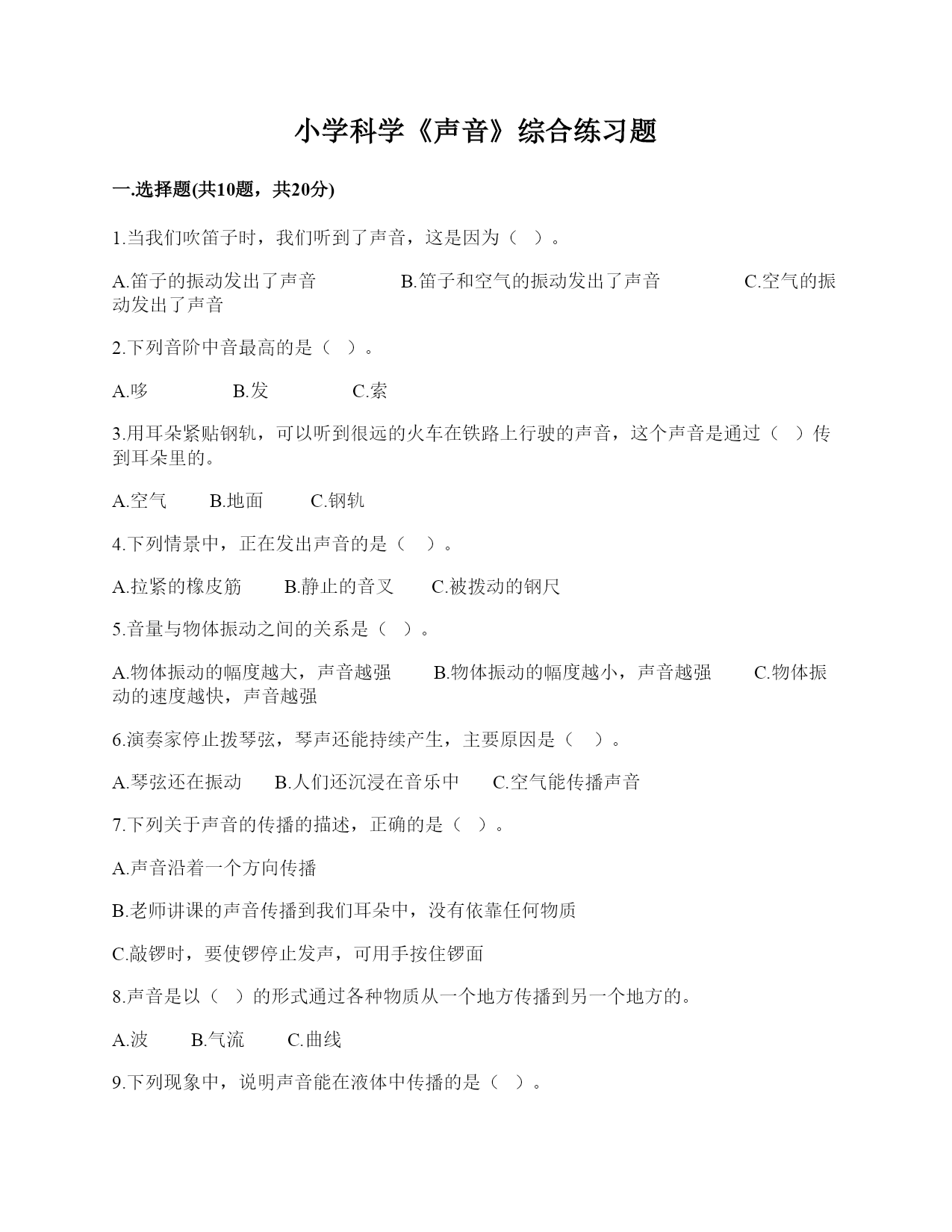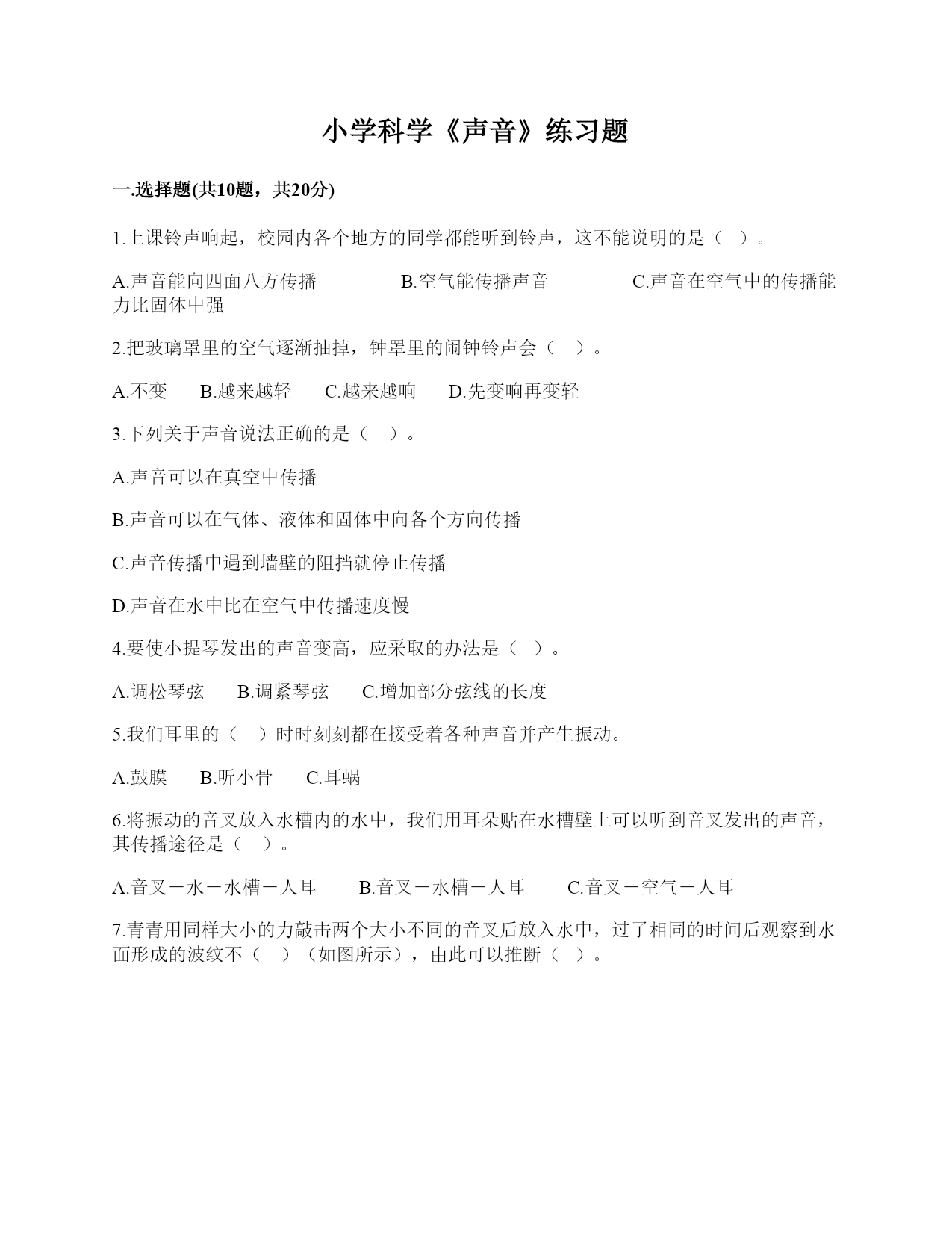 小学科学《声音》练习题一.选择题(共10题,共20分)1.上课铃声响起,校园内各个地方的同学都能听到铃声,这不能说明的是()。A.声音能向四面八方传播B.空气能传播声音C.声音在空气中的传播能力比固体中强2.电视机里的歌声是由()振动产生的。A.声带B.空气C.喇叭3.下列说法正确的是()。A.用手拍打墙面,可以听到声音,但没看到墙在振动,说明发声时不一定要振动B.老师讲课的声音是通过空气传播到我们耳朵的C.声音能在气体、固体中传播,不能在液体中传播4.要想让橡皮筋发出更高的声音,应该让橡皮筋()。A.松