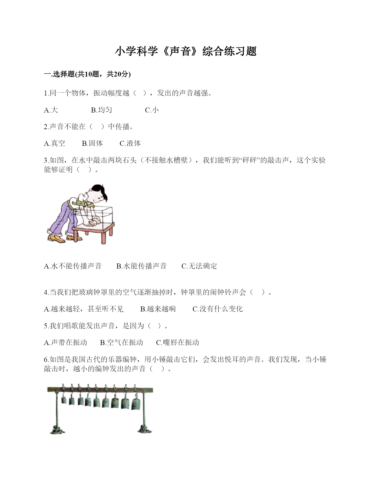 小学科学《声音》综合练习题一.选择题(共10题,共20分)1.同一个物体,振动幅度越(),发出的声音越强。A.大B.均匀C.小2.声音不能在()中传播。A.真空B.固体C.液体3.如图,在水中敲击两块石头(不接触水槽壁),我们能听到“砰砰”的敲击声,这个实验能够证明()。A.水不能传播声音B.水能传播声音C.无法确定4.当我们把玻璃钟罩里的空气逐渐抽掉时,钟罩里的闹钟铃声会()。A.越来越轻,甚至听不见B.越来越响C.没有什么变化5.我们唱歌能发出声音,是因为()。A.声带在振动B.空气在振动C.嘴唇在振