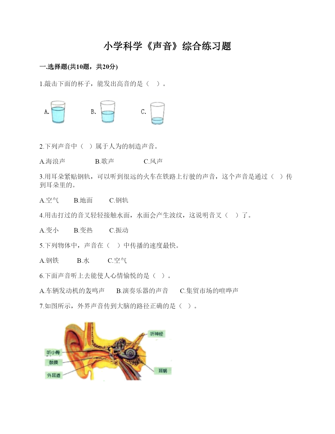 小学科学《声音》综合练习题一.选择题(共10题,共20分)1.敲击下面的杯子,能发出高音的是()。2.下列声音中()属于人为的制造声音。A.海浪声B.歌声C.风声3.用耳朵紧贴钢轨,可以听到很远的火车在铁路上行驶的声音,这个声音是通过()传到耳朵里的。A.空气B.地面C.钢轨4.用击打过的音叉轻轻接触水面,水面会产生波纹,这说明音叉()了。A.变小B.变热C.振动5.下列物体中,声音在()中传播的速度最快。A.钢铁B.水C.空气6.下面声音听上去能使人心情愉悦的是()。A.车辆发动机的轰鸣声B.演奏乐器的