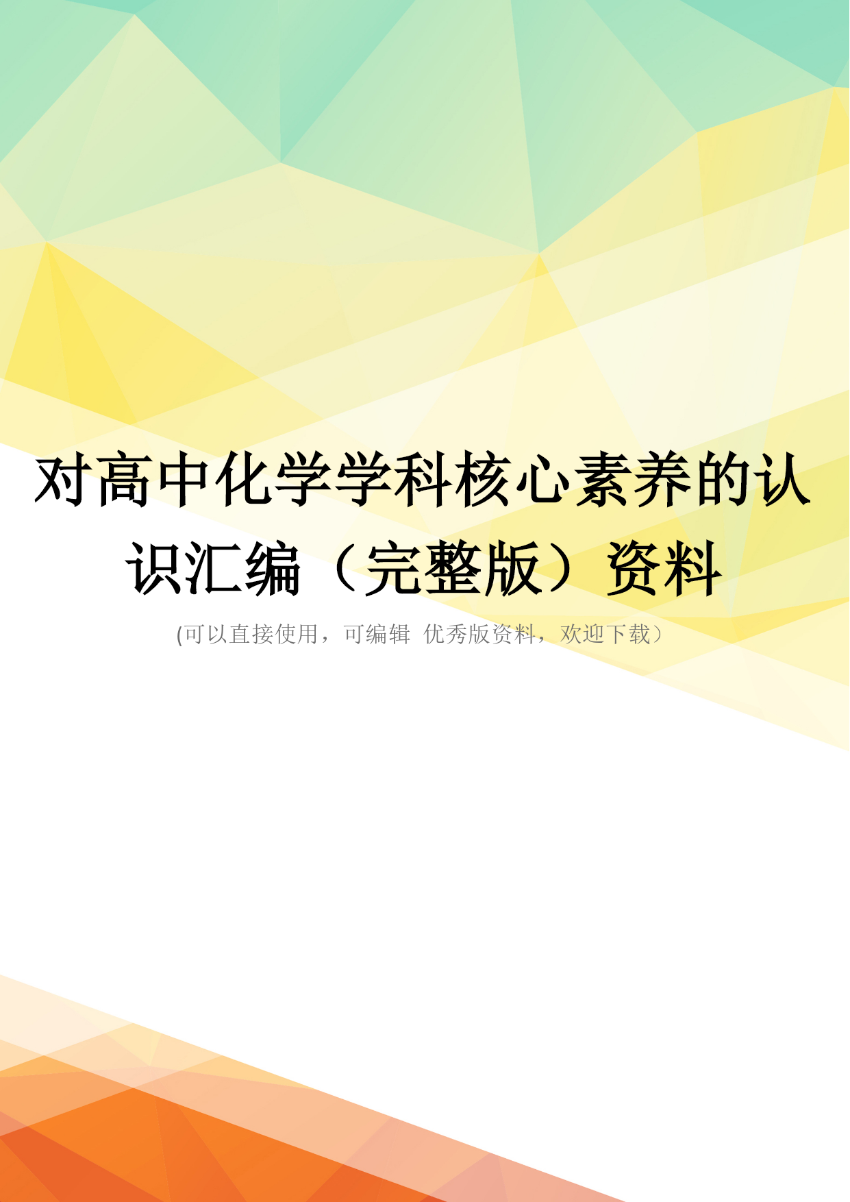 对高中化学学科核心素养的认识汇编(完整版)资料(可以直接使用,可编辑优秀版资料,欢迎下载)对高中化学学科核心素养的认识杨梓生(龙岩市普通教育教学研究室,福建龙岩364000)为落实“立德树人”的教育根本任务、充分发挥课程在人才培养中的核心作用,高中化学课程标准修订组根据“中国学生发展核心素养(征求意见稿)”和高中化学课程特点,提出包含“宏观辨识与微观探析”“变化观念与平衡思想”“证据推理与模型认识”“实验探究与创新意识”“科学精神和社会责任”等五个要素的高中化学核心素养(简称“化学核心素养”)[1]。为使