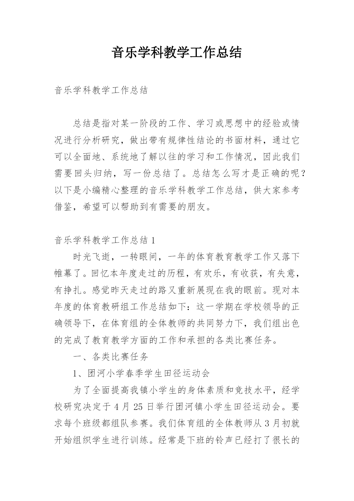 音乐学科教学工作总结音乐学科教学工作总结总结是指对某一阶段的工作、学习或思想中的经验或情况进行分析研究,做出带有规律性结论的书面材料,通过它可以全面地、系统地了解以往的学习和工作情况,因此我们需要回头归纳,写一份总结了。总结怎么写才是正确的呢?以下是小编精心整理的音乐学科教学工作总结,供大家参考借鉴,希望可以帮助到有需要的朋友。音乐学科教学工作总结1时光飞逝,一转眼间,一年的体育教育教学工作又落下帷幕了。回忆本年度走过的历程,有欢乐,有收获,有失意,有挣扎。感觉昨天走过的路又重新展现在我的眼前。现对本年度