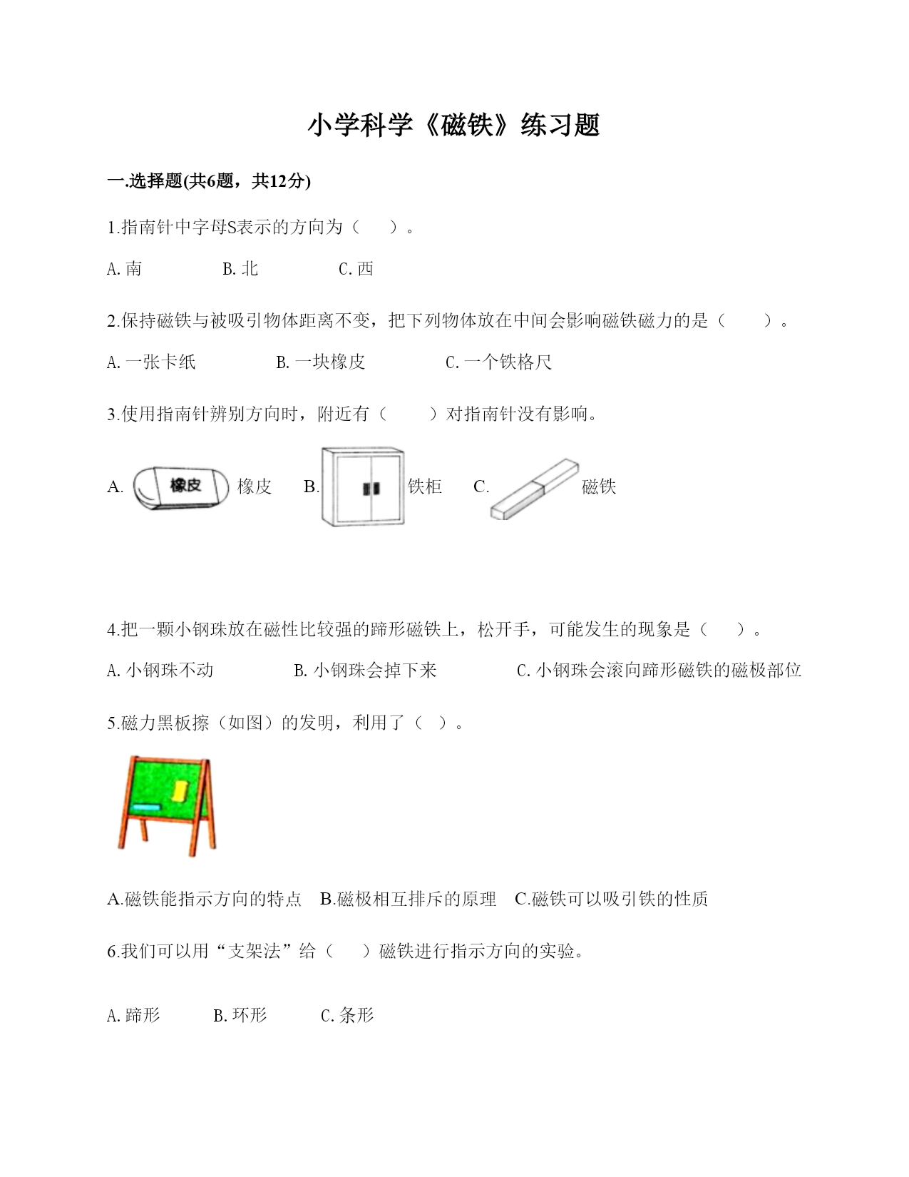 小学科学《磁铁》练习题一.选择题(共6题,共12分)1.指南针中字母S表示的方向为()。A.南B.北C.西2.保持磁铁与被吸引物体距离不变,把下列物体放在中间会影响磁铁磁力的是()。A.一张卡纸B.一块橡皮C.一个铁格尺3.使用指南针辨别方向时,附近有()对指南针没有影响。A.橡皮B.铁柜C.磁铁4.把一颗小钢珠放在磁性比较强的蹄形磁铁上,松开手,可能发生的现象是()。A.小钢珠不动B.小钢珠会掉下来C.小钢珠会滚向蹄形磁铁的磁极部位5.磁力黑板擦(如图)的发明,利用了()。A.磁铁能指示方向的特点B.磁