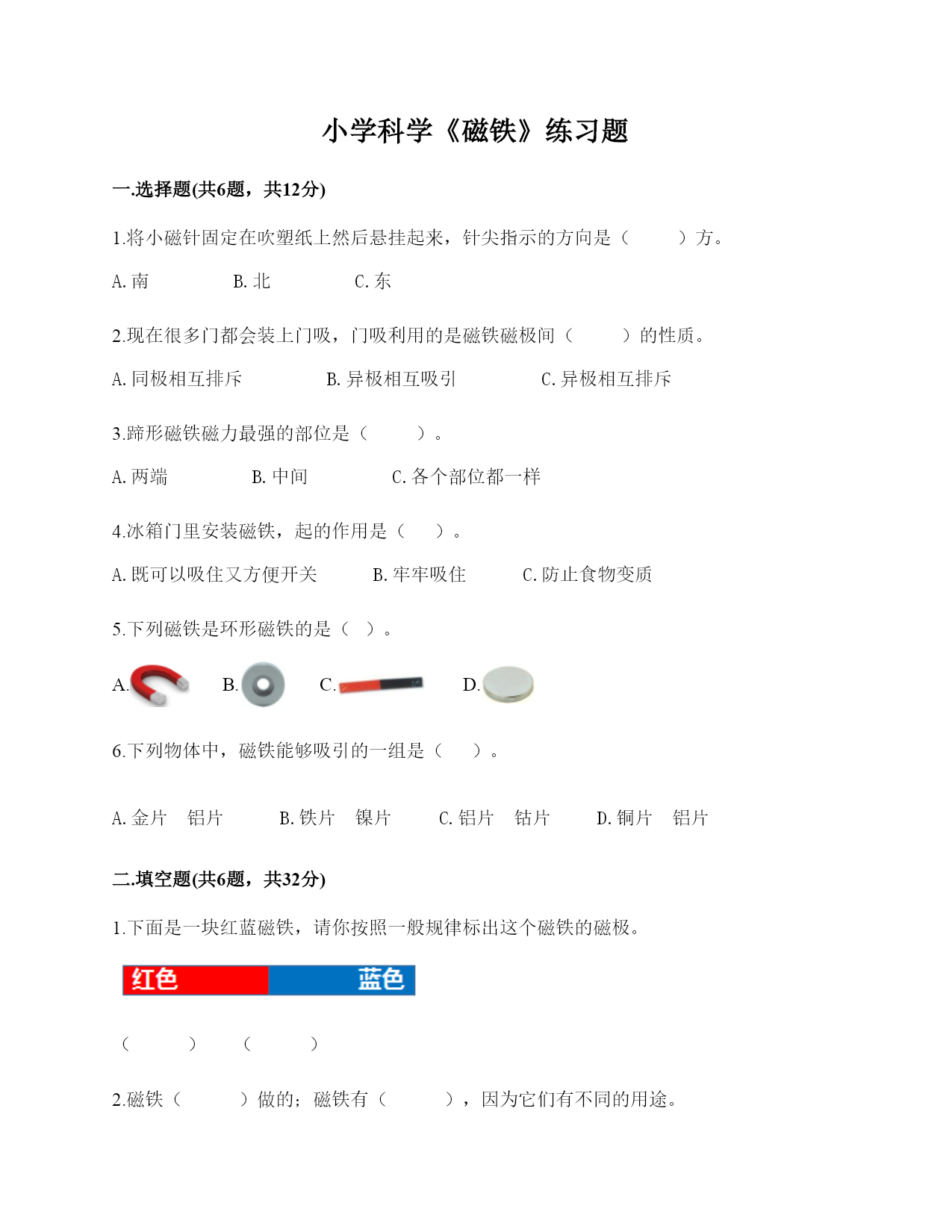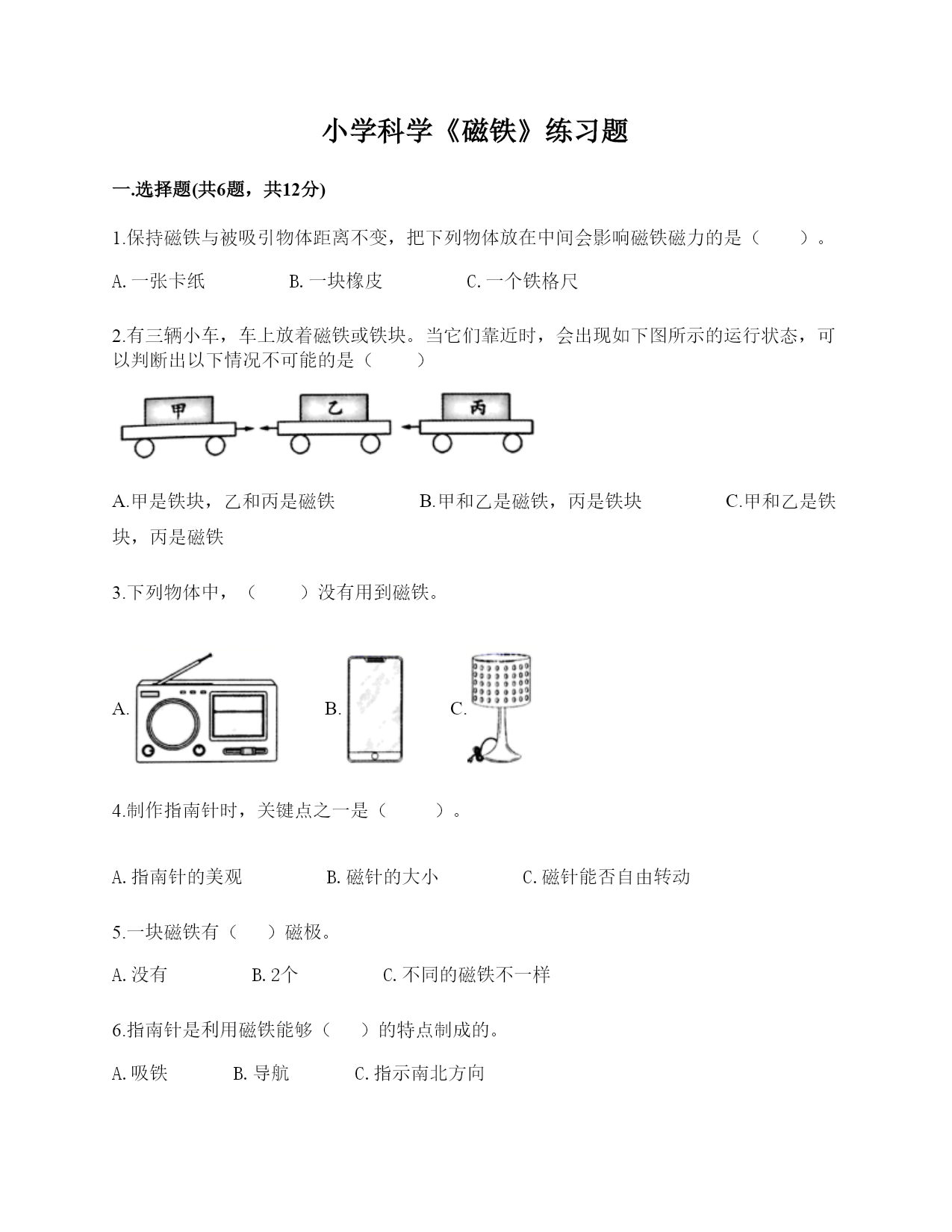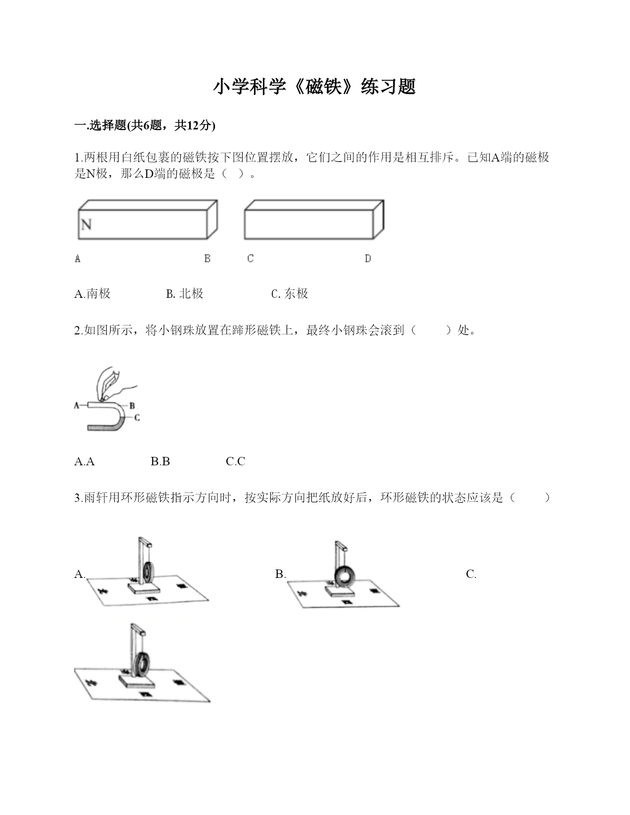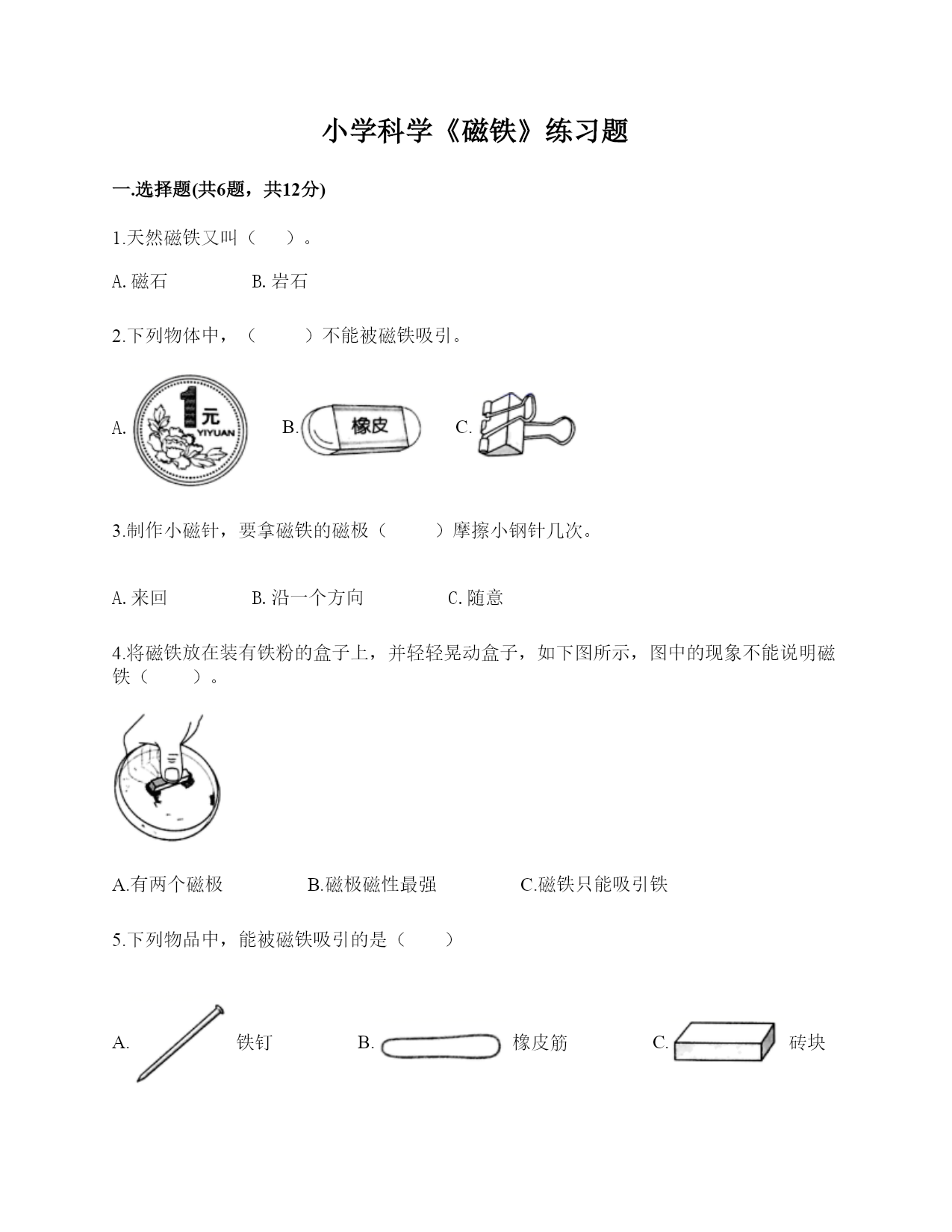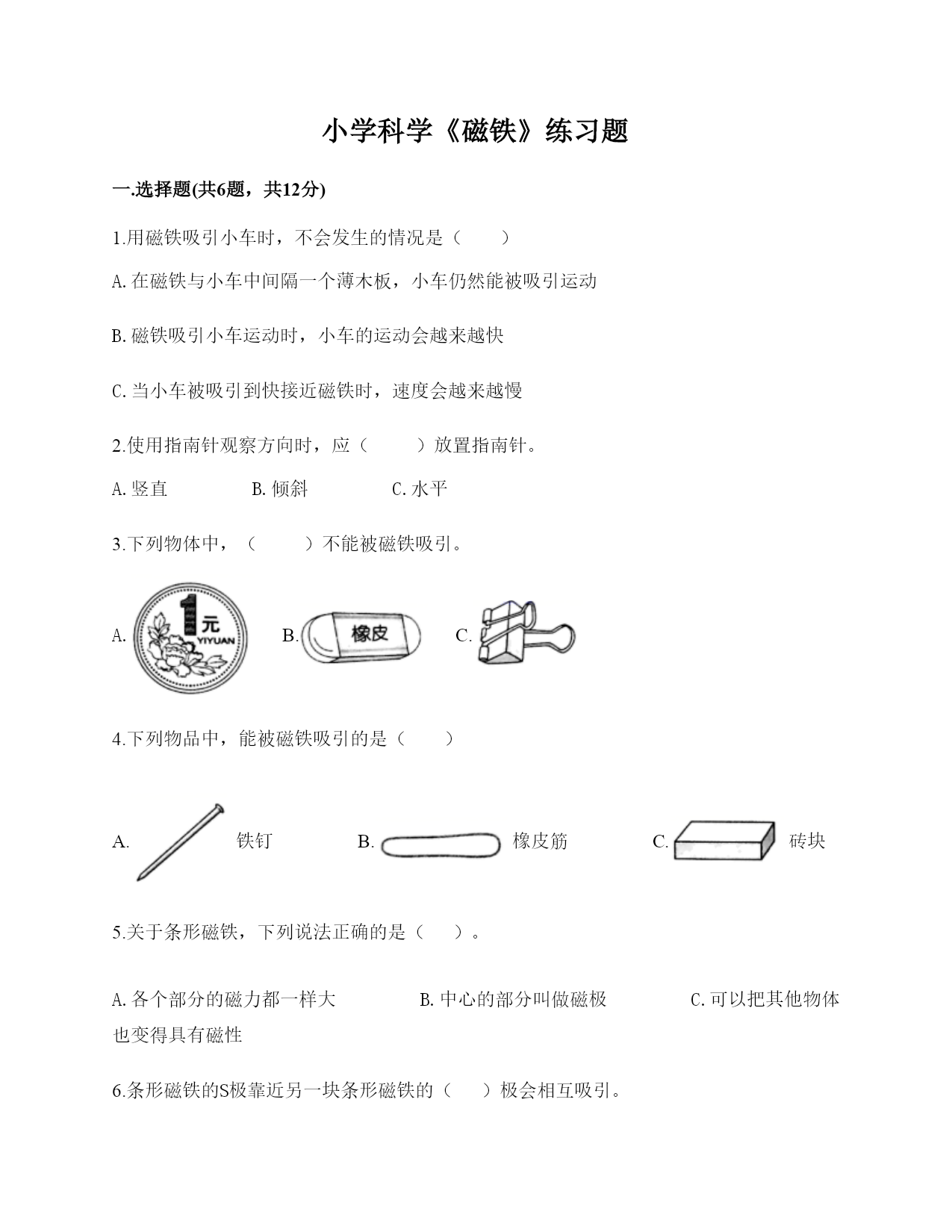 小学科学《磁铁》练习题一.选择题(共6题,共12分)1.用磁铁吸引小车时,不会发生的情况是()A.在磁铁与小车中间隔一个薄木板,小车仍然能被吸引运动B.磁铁吸引小车运动时,小车的运动会越来越快C.当小车被吸引到快接近磁铁时,速度会越来越慢2.使用指南针观察方向时,应()放置指南针。A.竖直B.倾斜C.水平3.下列物体中,()不能被磁铁吸引。A.B.C.4.下列物品中,能被磁铁吸引的是()A.铁钉B.橡皮筋C.砖块5.关于条形磁铁,下列说法正确的是()。A.各个部分的磁力都一样大B.中心的部分叫做磁极C.可
