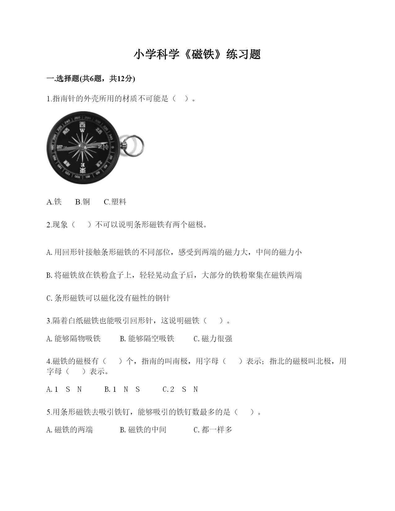 小学科学《磁铁》练习题一.选择题(共6题,共12分)1.指南针的外壳所用的材质不可能是()。A.铁B.铜C.塑料2.现象()不可以说明条形磁铁有两个磁极。A.用回形针接触条形磁铁的不同部位,感受到两端的磁力大,中间的磁力小B.将磁铁放在铁粉盒子上,轻轻晃动盒子后,大部分的铁粉聚集在磁铁两端C.条形磁铁可以磁化没有磁性的钢针3.隔着白纸磁铁也能吸引回形针,这说明磁铁()。A.能够隔物吸铁B.能够隔空吸铁C.磁力很强4.磁铁的磁极有()个,指南的叫南极,用字母()表示;指北的磁极叫北极,用字母()表示。A.1