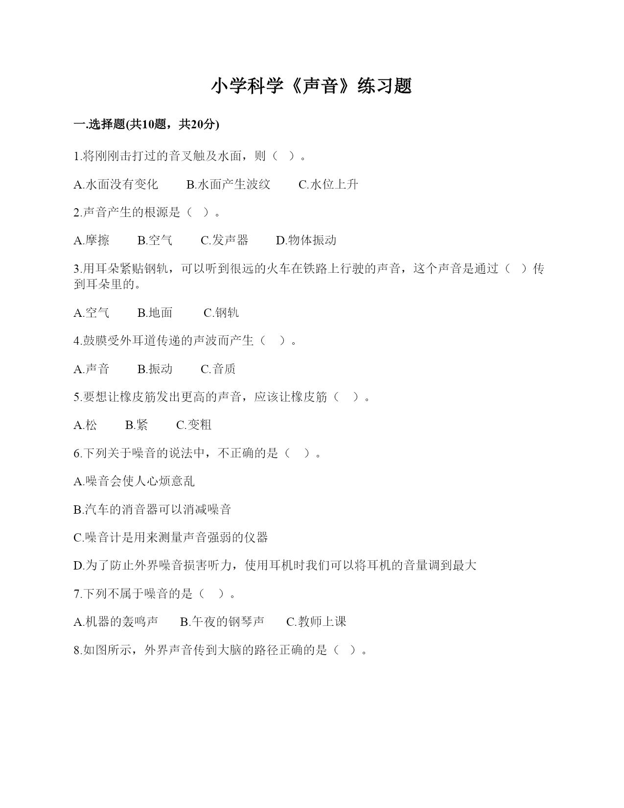 小学科学《声音》练习题一.选择题(共10题,共20分)1.将刚刚击打过的音叉触及水面,则()。A.水面没有变化B.水面产生波纹C.水位上升2.声音产生的根源是()。A.摩擦B.空气C.发声器D.物体振动3.用耳朵紧贴钢轨,可以听到很远的火车在铁路上行驶的声音,这个声音是通过()传到耳朵里的。A.空气B.地面C.钢轨4.鼓膜受外耳道传递的声波而产生()。A.声音B.振动C.音质5.要想让橡皮筋发出更高的声音,应该让橡皮筋()。A.松B.紧C.变粗6.下列关于噪音的说法中,不正确的是()。A.噪音会使人心烦意