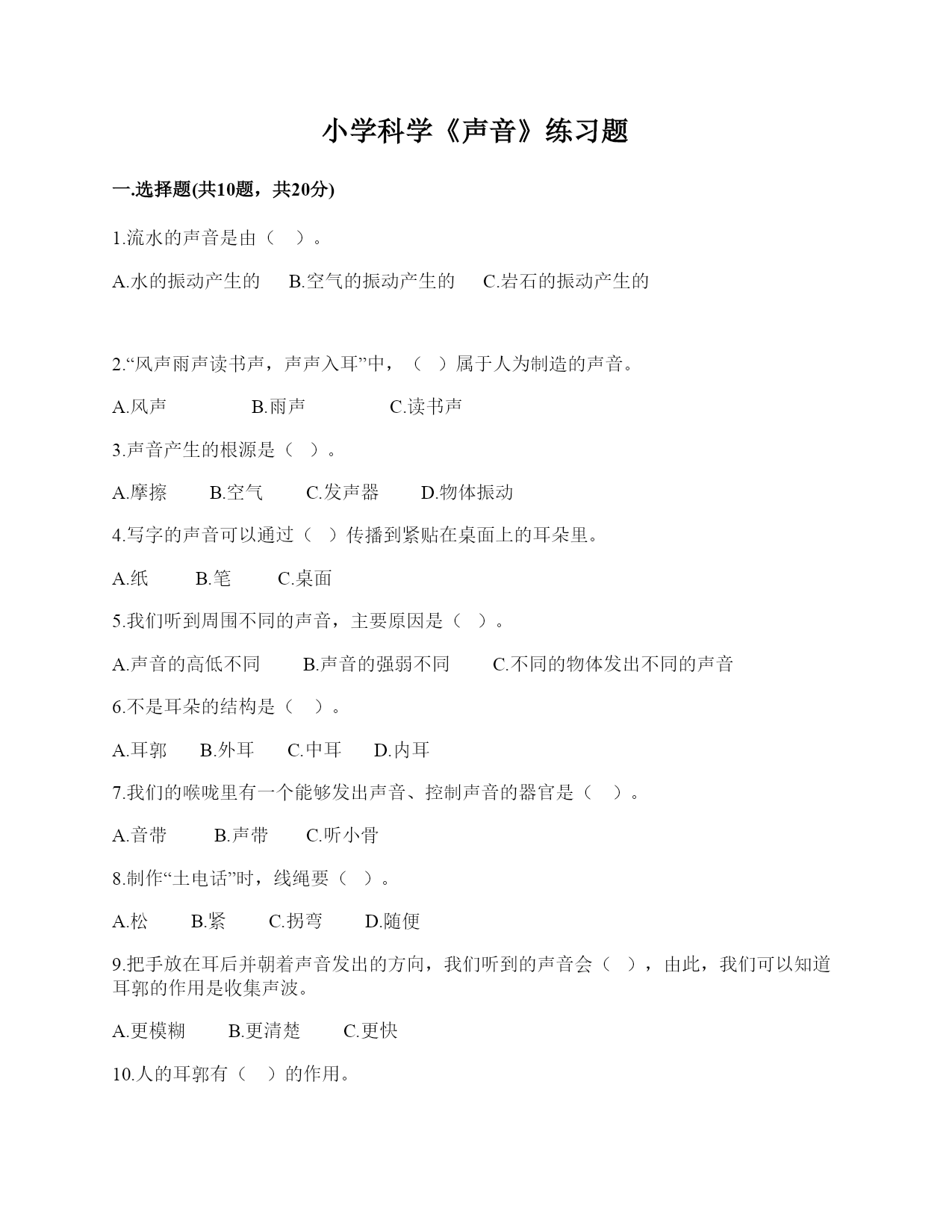 小学科学《声音》练习题一.选择题(共10题,共20分)1.流水的声音是由()。A.水的振动产生的B.空气的振动产生的C.岩石的振动产生的2.“风声雨声读书声,声声入耳”中,()属于人为制造的声音。A.风声B.雨声C.读书声3.声音产生的根源是()。A.摩擦B.空气C.发声器D.物体振动4.写字的声音可以通过()传播到紧贴在桌面上的耳朵里。A.纸B.笔C.桌面5.我们听到周围不同的声音,主要原因是()。A.声音的高低不同B.声音的强弱不同C.不同的物体发出不同的声音6.不是耳朵的结构是()。A.耳郭B.外耳