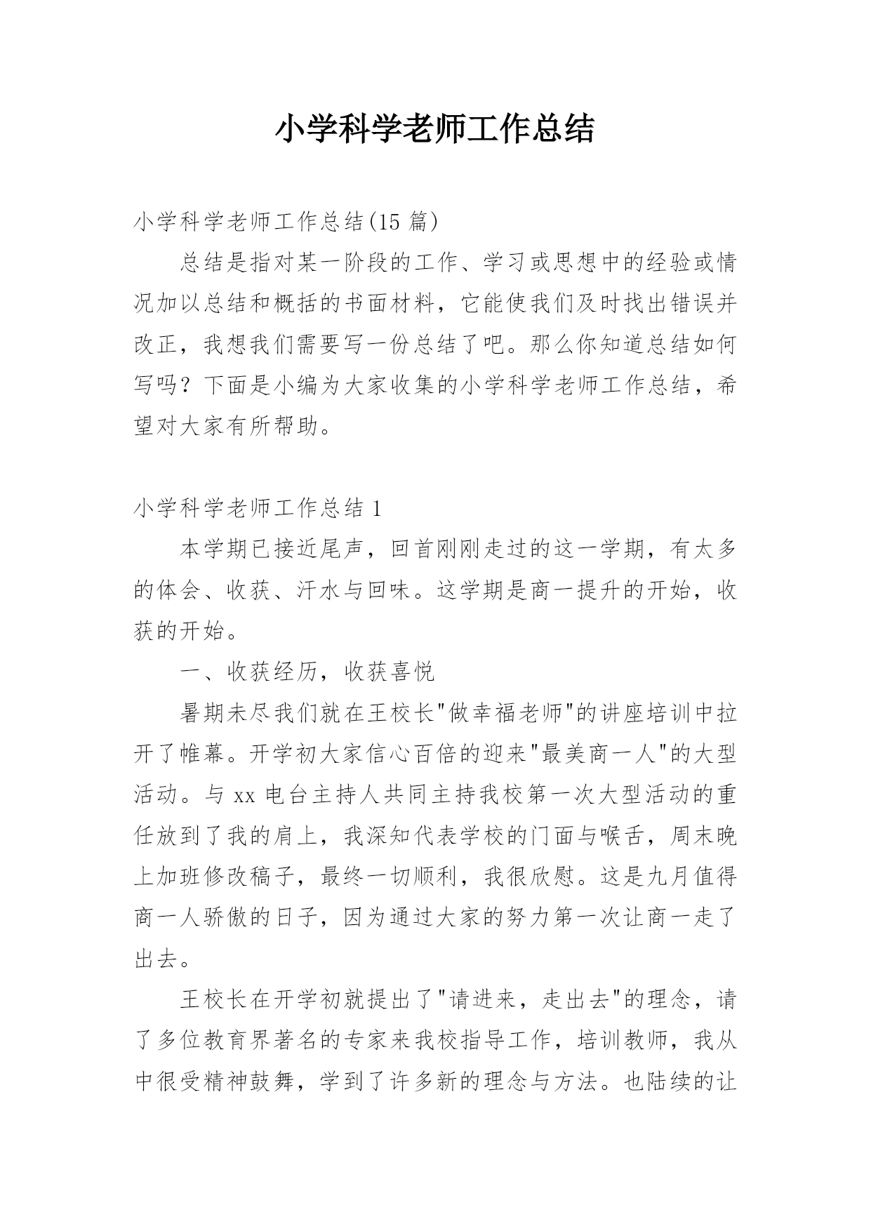 小学科学老师工作总结小学科学老师工作总结(15篇)总结是指对某一阶段的工作、学习或思想中的经验或情况加以总结和概括的书面材料,它能使我们及时找出错误并改正,我想我们需要写一份总结了吧。那么你知道总结如何写吗?下面是小编为大家收集的小学科学老师工作总结,希望对大家有所帮助。小学科学老师工作总结1本学期已接近尾声,回首刚刚走过的这一学期,有太多的体会、收获、汗水与回味。这学期是商一提升的开始,收获的开始。一、收获经历,收获喜悦暑期未尽我们就在王校长"做幸福老师"的讲座培训中拉开了帷幕。开学初大家信心百倍的迎来