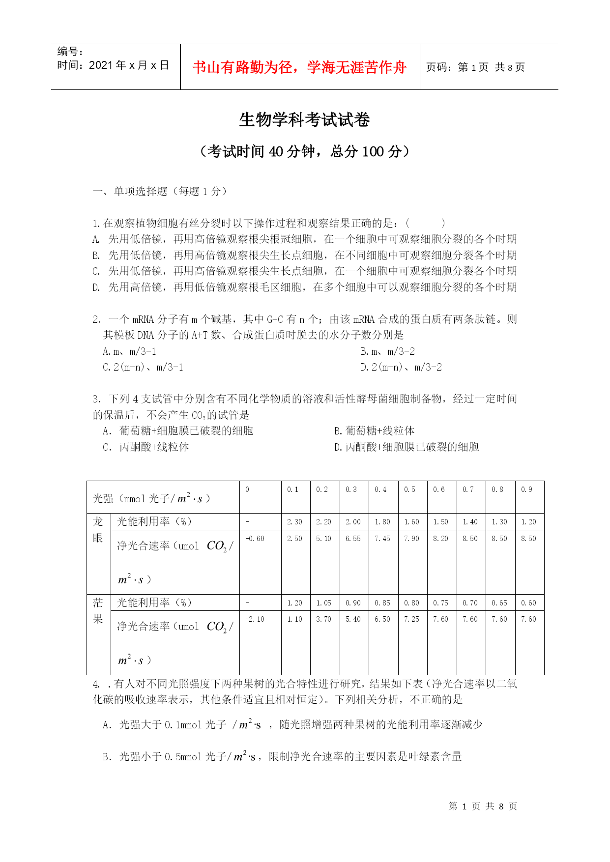 编号:时间:2021年x月x日书山有路勤为径,学海无涯苦作舟页码:第PAGE8页共NUMPAGES8页第PAGE\*MERGEFORMAT8页共NUMPAGES\*MERGEFORMAT8页生物学科考试试卷(考试时间40分钟,总分100分)单项选择题(每题1分)1.在观察植物细胞有丝分裂时以下操作过程和观察结果正确的是:()A.先用低倍镜,再用高倍镜观察根尖根冠细胞,在一个细胞中可观察细胞分裂的各个时期B.先用低倍镜,再用高倍镜观察根尖生长点细胞,在不同细胞中可观察细胞分裂各个时期