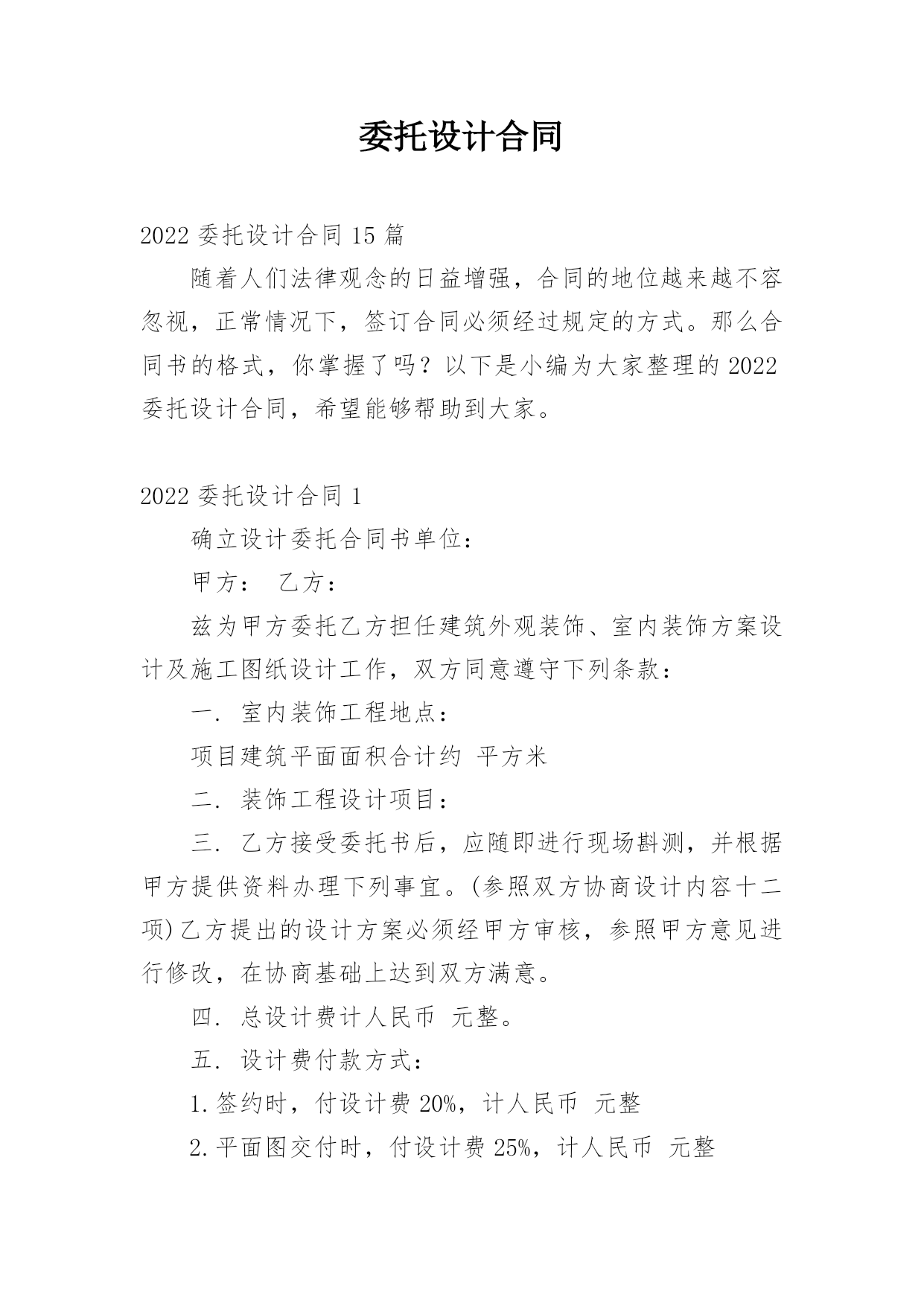 委托设计合同2022委托设计合同15篇随着人们法律观念的日益增强,合同的地位越来越不容忽视,正常情况下,签订合同必须经过规定的方式。那么合同书的格式,你掌握了吗?以下是小编为大家整理的2022委托设计合同,希望能够帮助到大家。2022委托设计合同1确立设计委托合同书单位:甲方:乙方:兹为甲方委托乙方担任建筑外观装饰、室内装饰方案设计及施工图纸设计工作,双方同意遵守下列条款:一.室内装饰工程地点:项目建筑平面面积合计约平方米二.装饰工程设计项目:三.乙方接受委托书后,应随即进行现场斟测,并根据甲方提供资料办
