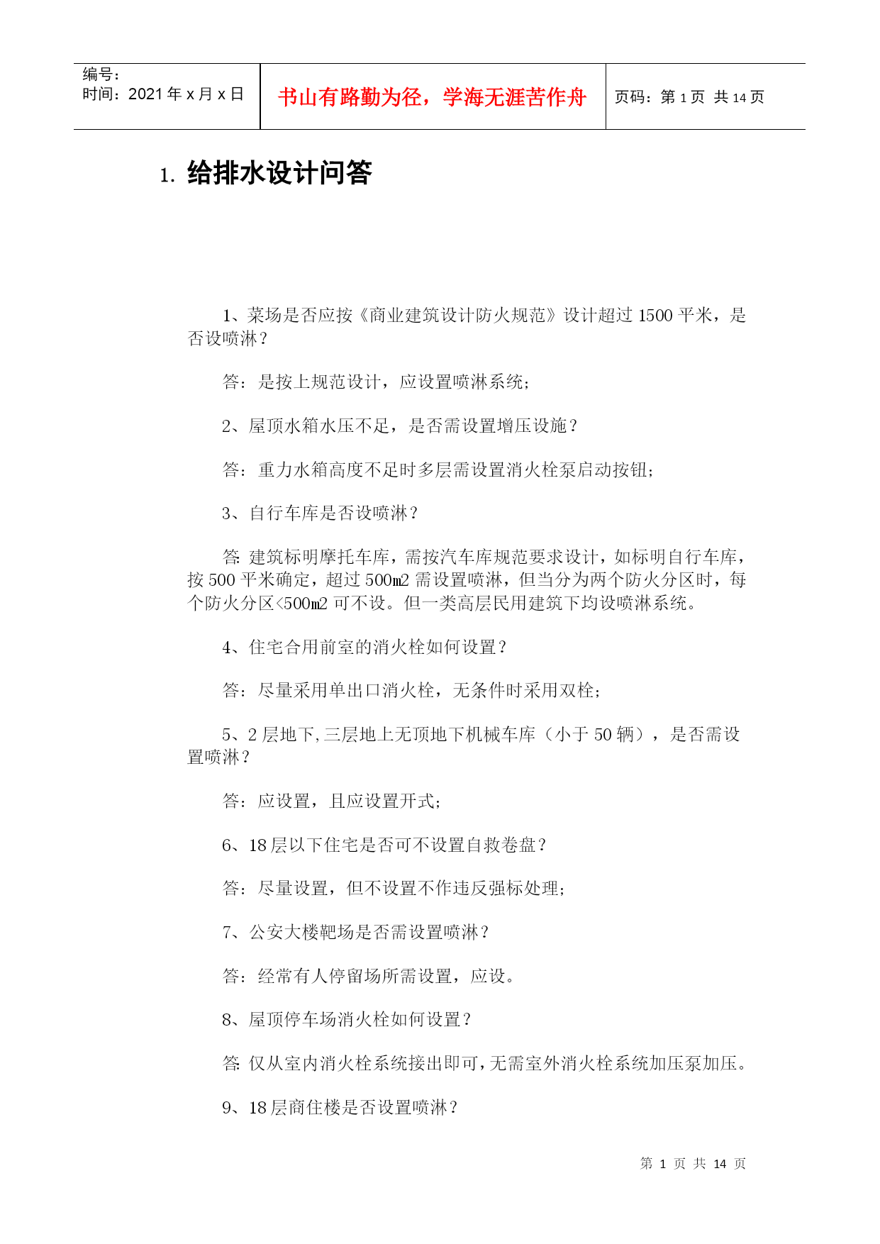 编号:时间:2021年x月x日书山有路勤为径,学海无涯苦作舟页码:第PAGE14页共NUMPAGES14页第PAGE\*MERGEFORMAT14页共NUMPAGES\*MERGEFORMAT14页给排水设计问答1、菜场是否应按《商业建筑设计防火规范》设计超过1500平米,是否设喷淋?答:是按上规范设计,应设置喷淋系统;2、屋顶水箱水压不足,是否需设置增压设施?答:重力水箱高度不足时多层需设置消火栓泵启动按钮;3、自行车库是否设喷淋?答:建筑标明摩托车库,需按汽车库规范要求设计,如