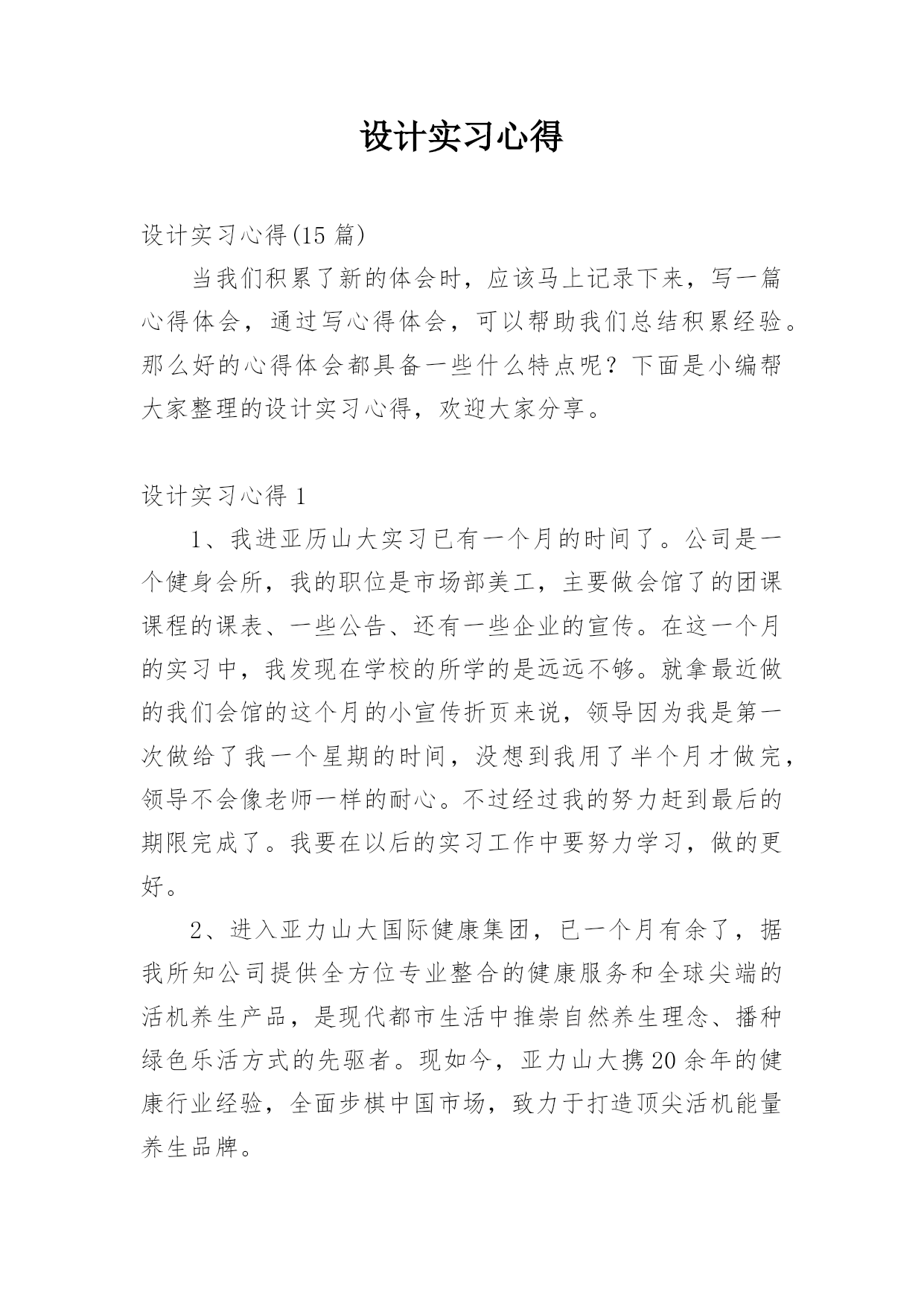设计实习心得设计实习心得(15篇)当我们积累了新的体会时,应该马上记录下来,写一篇心得体会,通过写心得体会,可以帮助我们总结积累经验。那么好的心得体会都具备一些什么特点呢?下面是小编帮大家整理的设计实习心得,欢迎大家分享。设计实习心得11、我进亚历山大实习已有一个月的时间了。公司是一个健身会所,我的职位是市场部美工,主要做会馆了的团课课程的课表、一些公告、还有一些企业的宣传。在这一个月的实习中,我发现在学校的所学的是远远不够。就拿最近做的我们会馆的这个月的小宣传折页来说,领导因为我是第一次做给了我一个星期